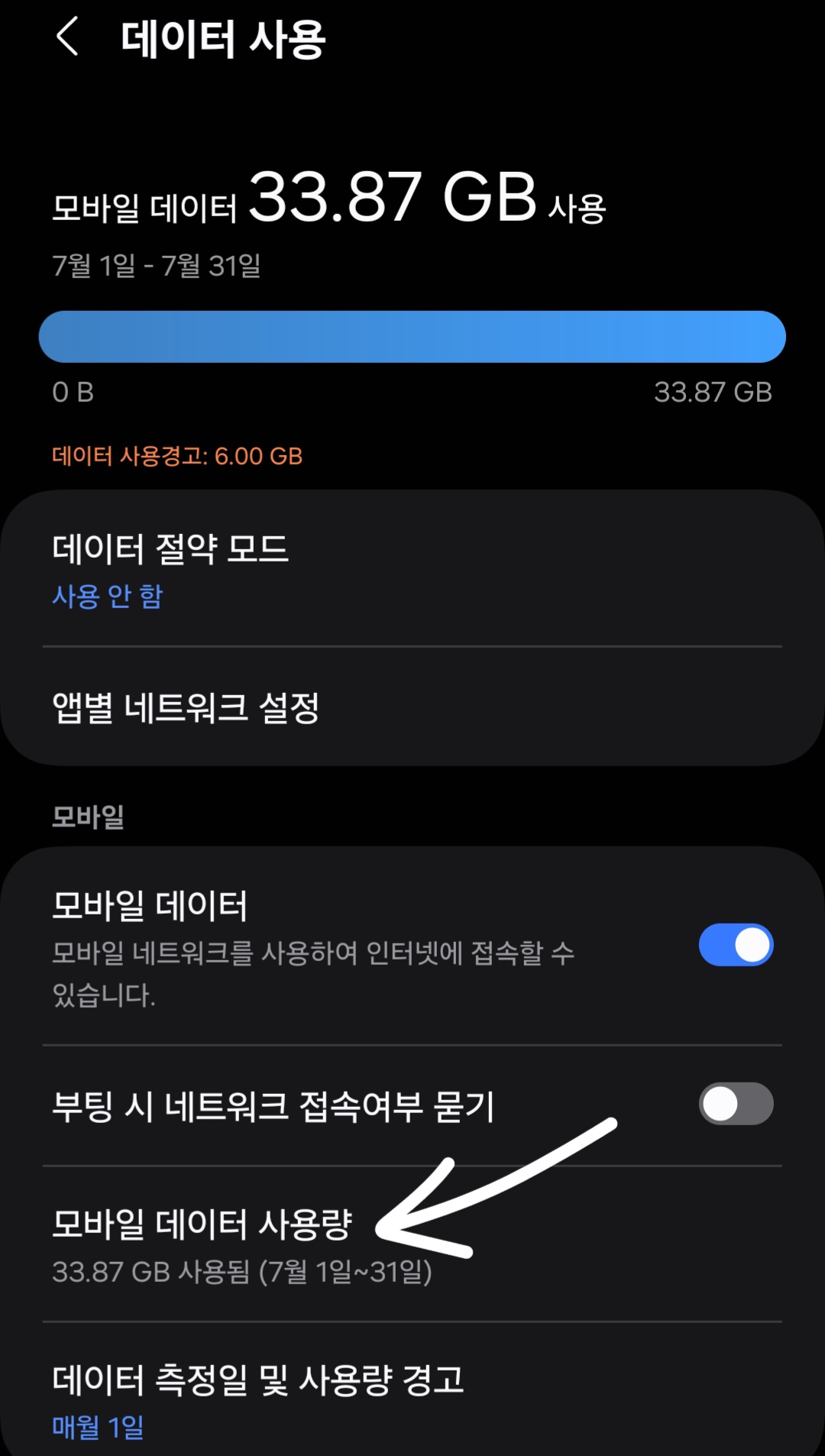 ▼그럼 현재까지 사용한 모바일 데이터를 확인할 수 있는데요. 어느 앱에서 제일 많이 사용됐는지 디테일하게 궁금하다면 [모바일 데이터 사용량]을 클릭해 줍니다.
