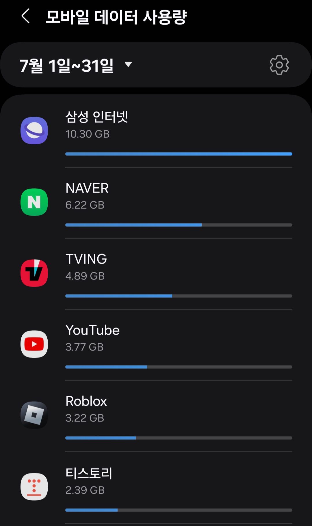 ▼밑으로 스크롤을 내리다 보면 어느 앱에서 몇 기가를 사용했는지 디테일하게 확인할 수 있습니다.