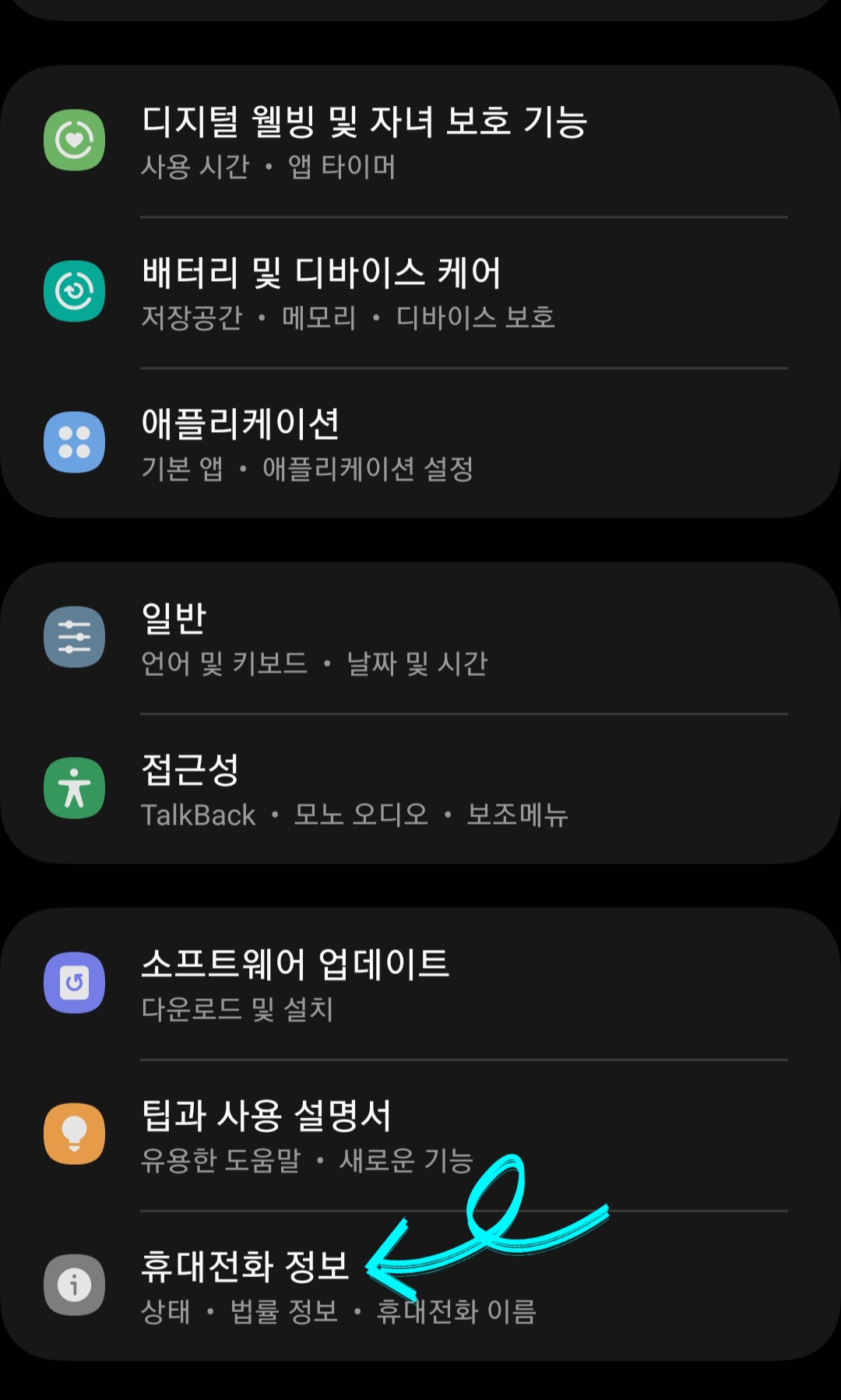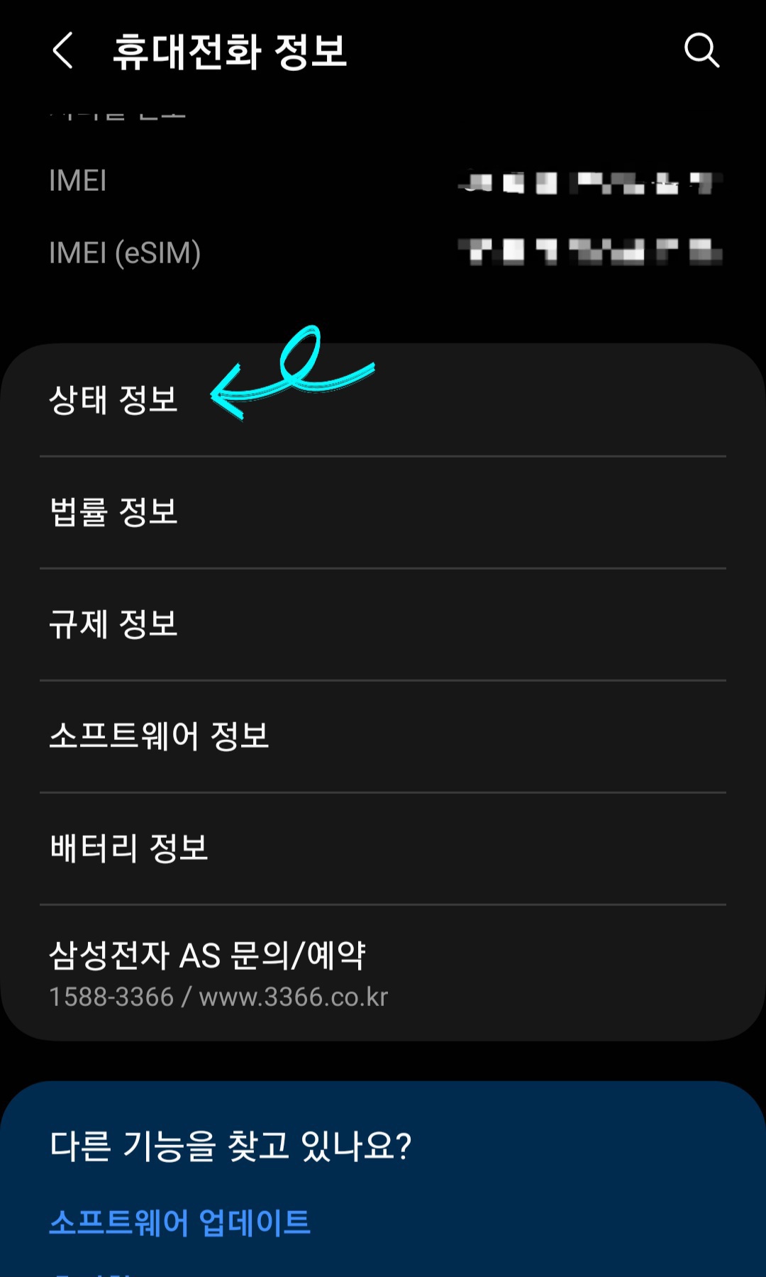 ▼그다음 스크롤을 밑으로 쭉 내려 [휴대전화 정보]를 클릭한 다음 [상태 정보]를 클릭해 주면 되는데요.