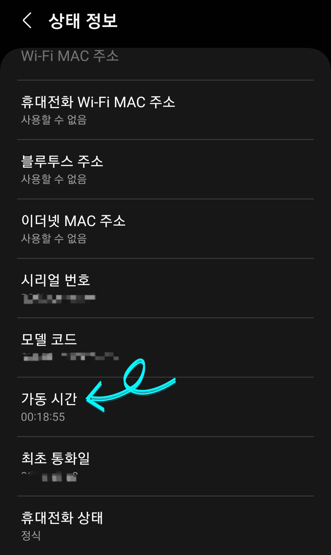 ▼그럼 핸드폰이 몇 시간째 가동되고 있었는지 확인할 수 있습니다. 핸드폰은 전원을 완전히 껐다 켜지 않는 이상 계속 작동이 되기 때문에 가동시간이 500시간 이상 넘어간다면 꼭 핸드폰 전원을 완전히 껐다가 3분 뒤에 다시 켜주세요. 그럼 어쩌다가 발생하는 버벅거림, 먹통 현상을 최소화시킬 수 있습니다.