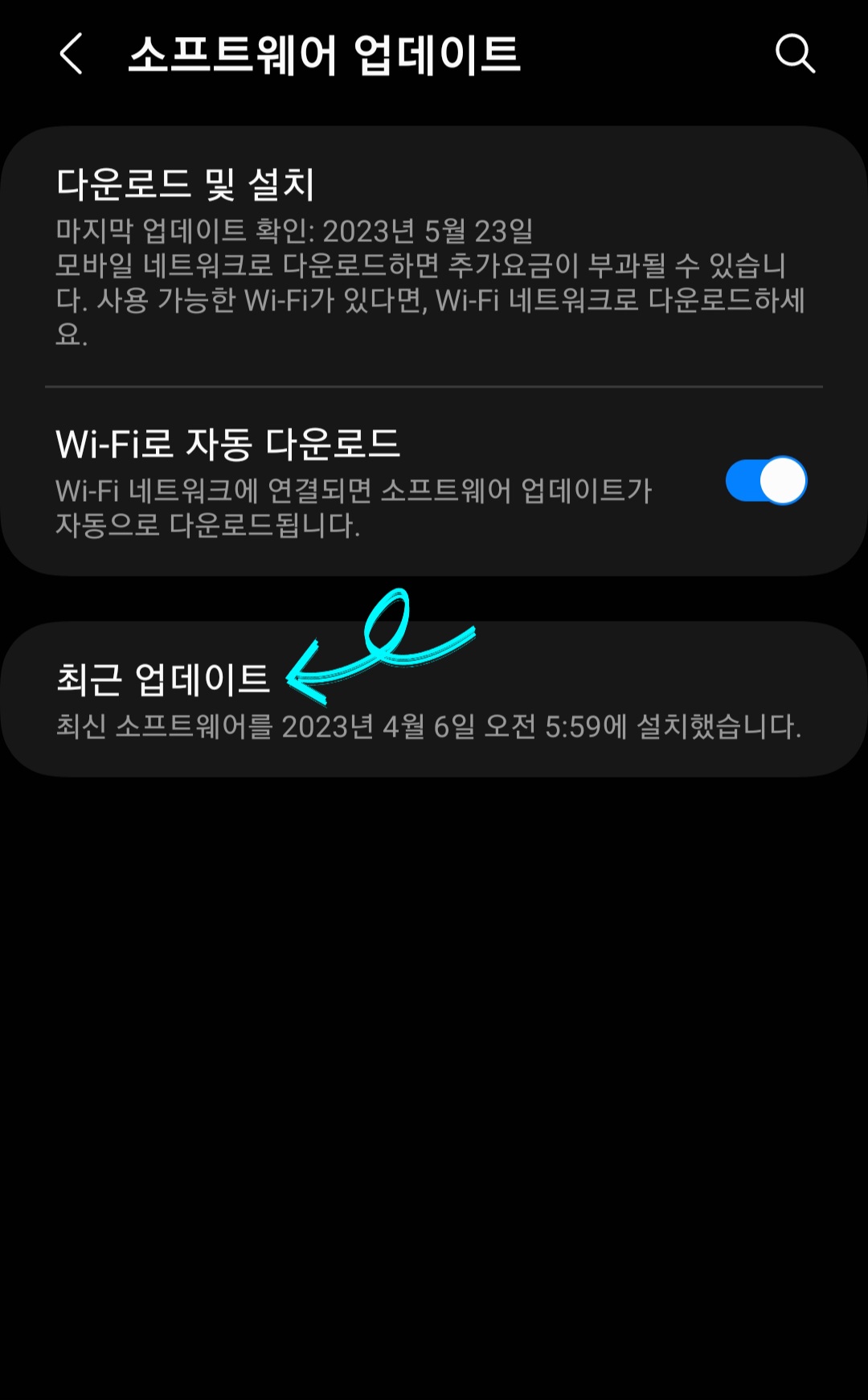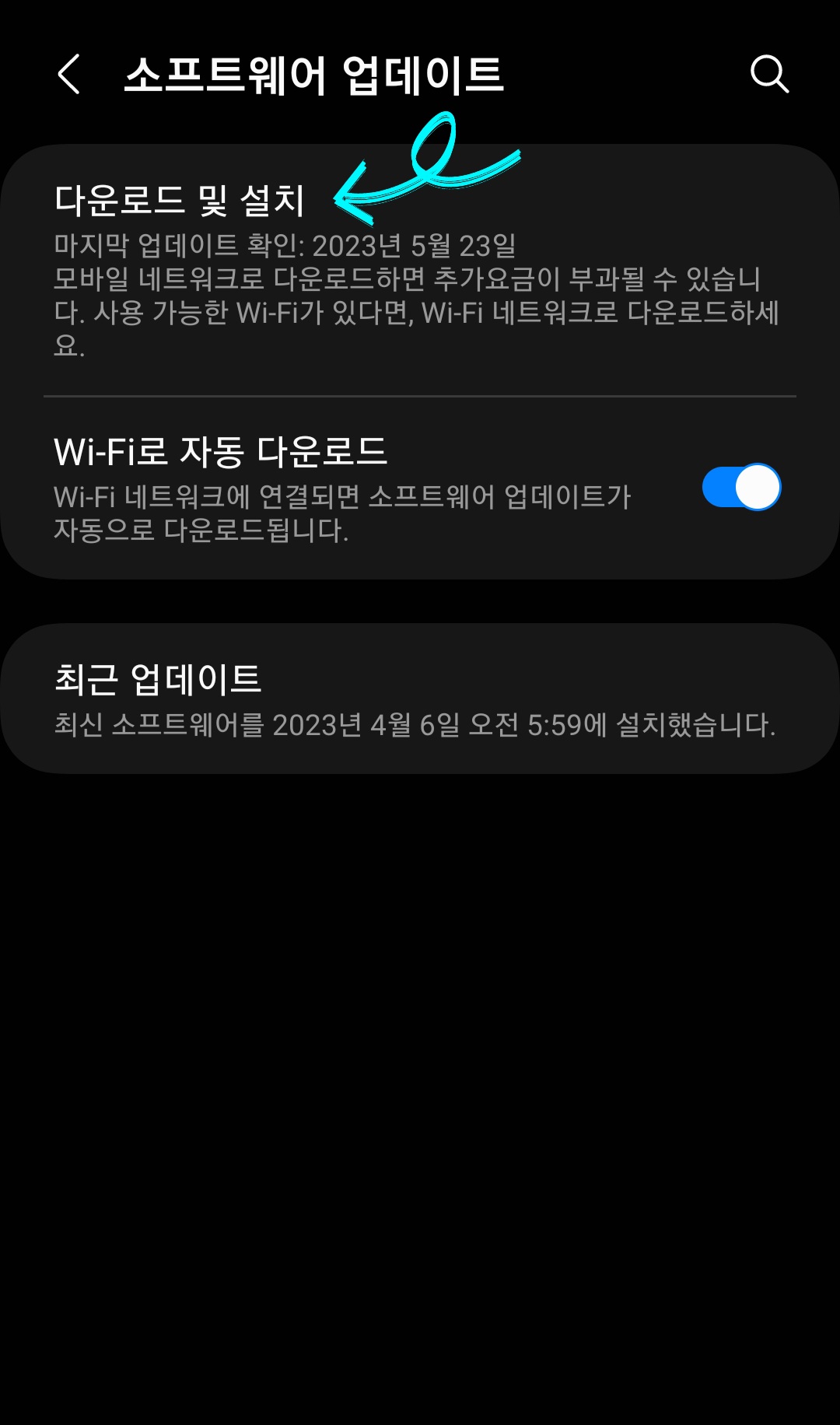 ▼생각보다 소프트웨어 업데이트를 오랫동안 안 한 것 같다면 [다운로드 및 설치]를 클릭하고 [최신 소프트웨어]인지 확인해 주면 됩니다. 만약 최신 소프트웨어가 아니라면 최신 소프트웨어로 다운로드해 주면 보다 최적의 상태로 핸드폰을 사용할 수 있습니다.