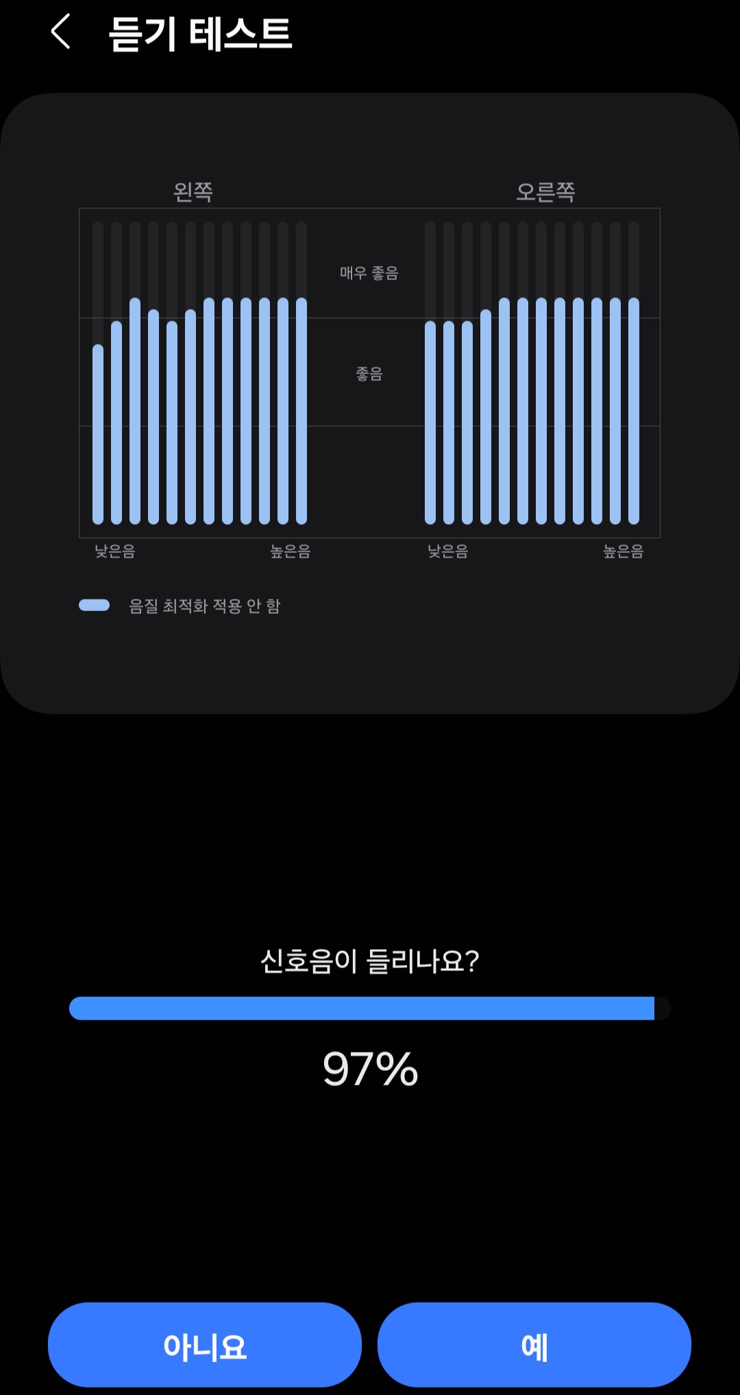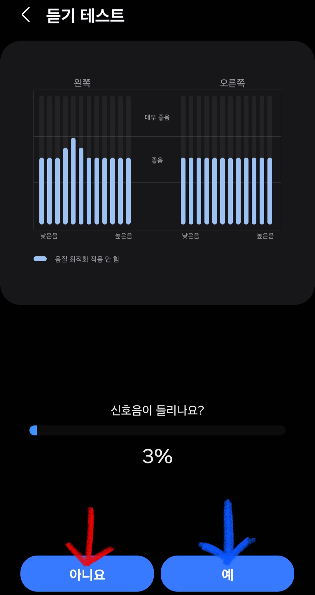 ▼그럼 이어폰에 가청주파수 소리가 들리는데요. 가청주파수 소리가 들리면 [예], 안들리면 [아니요]를 눌러주시면 됩니다.