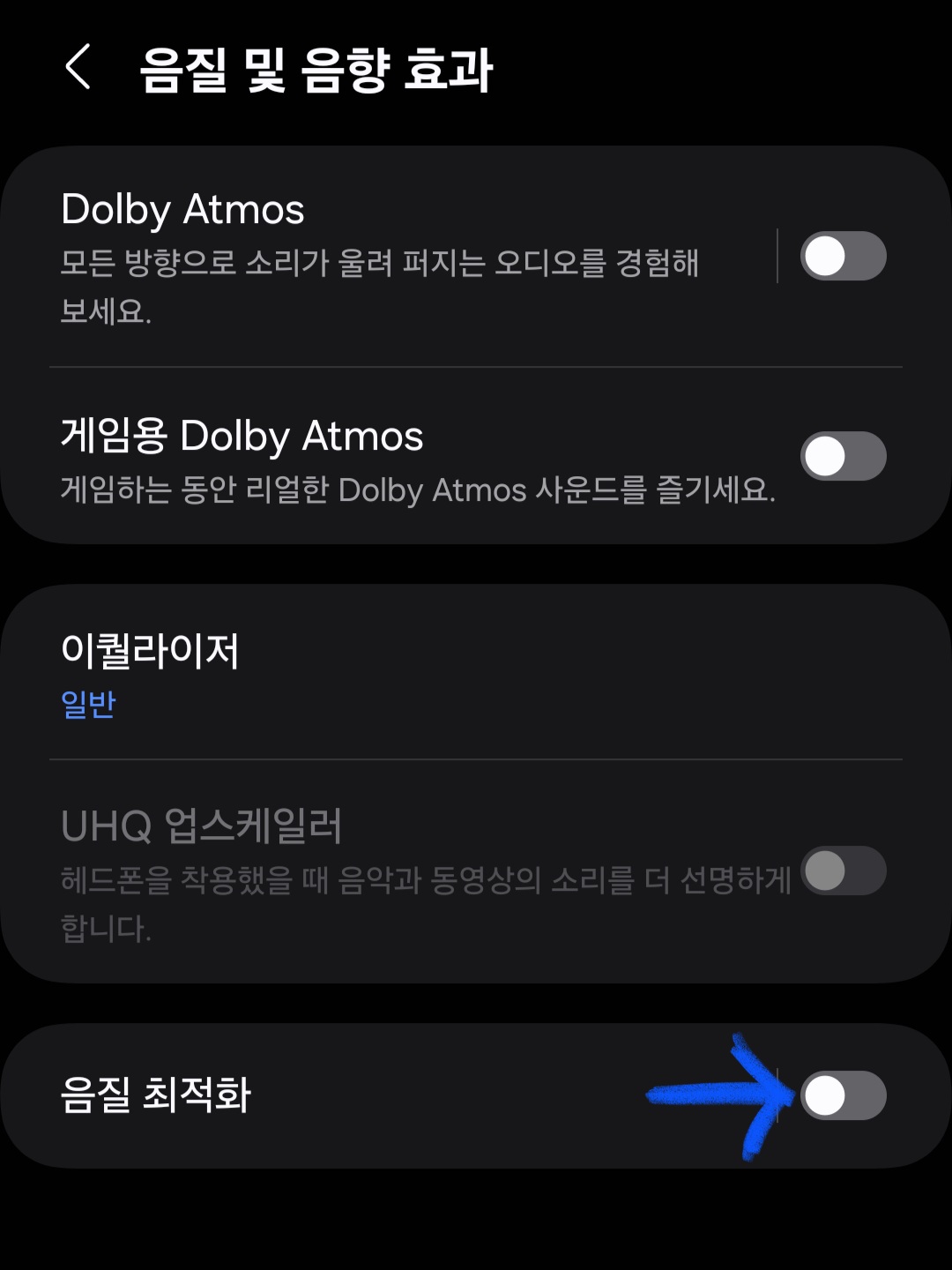 ▼그다음 [음질 및 음향 효과]을 클릭 후 [음질 최적화] 활성화를 해준 다음 [음질 최적화 글씨]를 클릭해 설정으로 들어가줍니다.