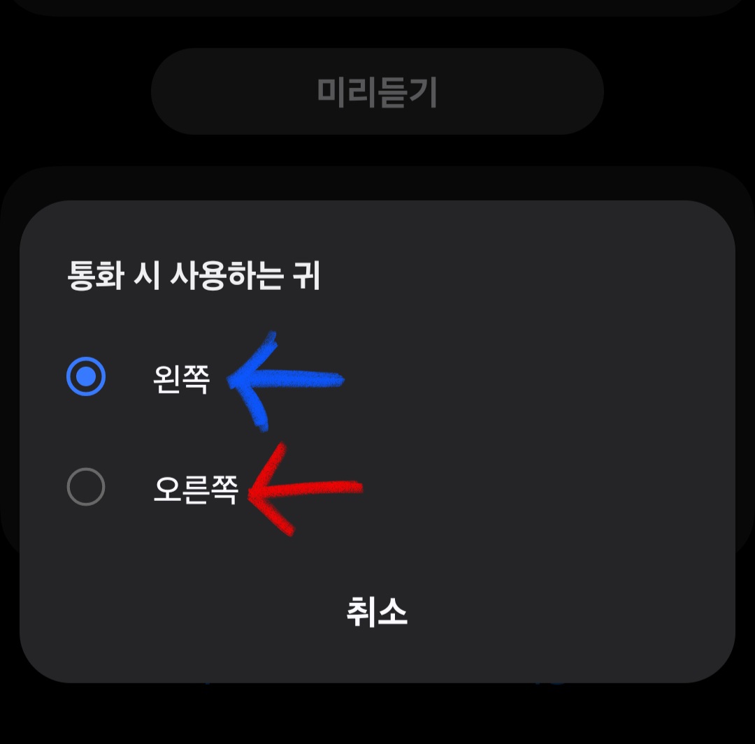 ▼가청주파수 테스트가 모두 끝나면 통화 시 자주 사용하는 귀를 선택 후 [저장]을 눌러주시면 모든 설정이 끝납니다.