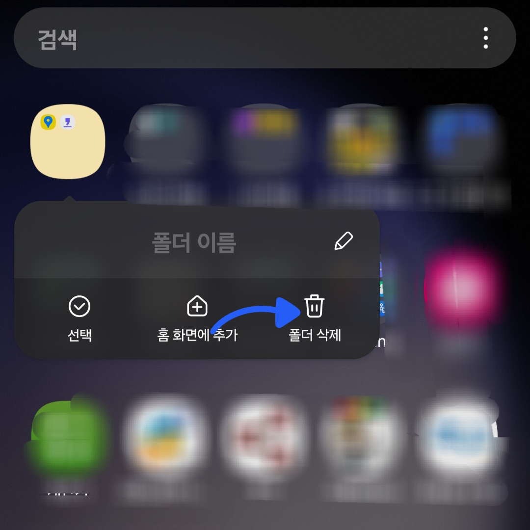 ▼앱끼리 뭉쳐있는 걸 해지하는 방법은 더욱 간편한데요. 삭제하고자 하는 폴더를 손가락으로 약 3초간 꾹 누르면 하단에 [삭제] 버튼을 눌러 삭제해 주면 됩니다. 그럼 폴더만 삭제되고 안에 있던 앱은 삭제되지 않습니다.