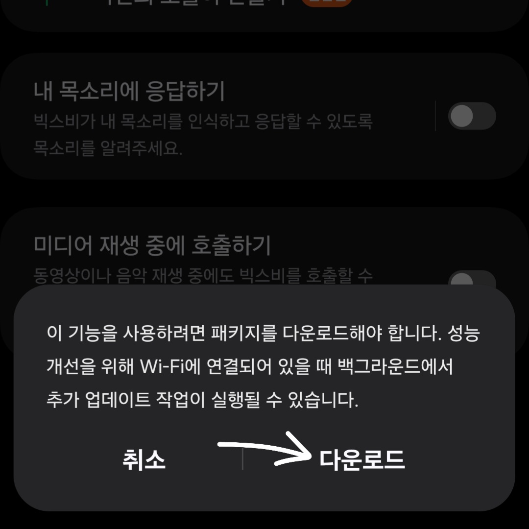 ▼그럼 빅스비 호출 설정란에 하이 빅스비 혹은 빅스비 말고도 [나만의 호출어 만들기]가 뜨는데 그걸 클릭해 준 다음 간단한 [다운로드]를 진행해 줍니다.