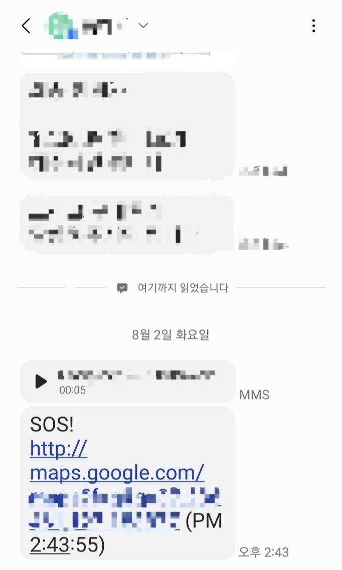 ▼이런 식으로 SOS 메시지 설정할 때 등록해놓은 연락처로 SOS 메시지가 전달이 되며 현재 주의 소음이나 대화 내용을 5초 동안 녹음된 파일과 현재 위치한 링크도 같이 보내 링크를 클릭 시 지도로도 확인할 수가 있습니다.