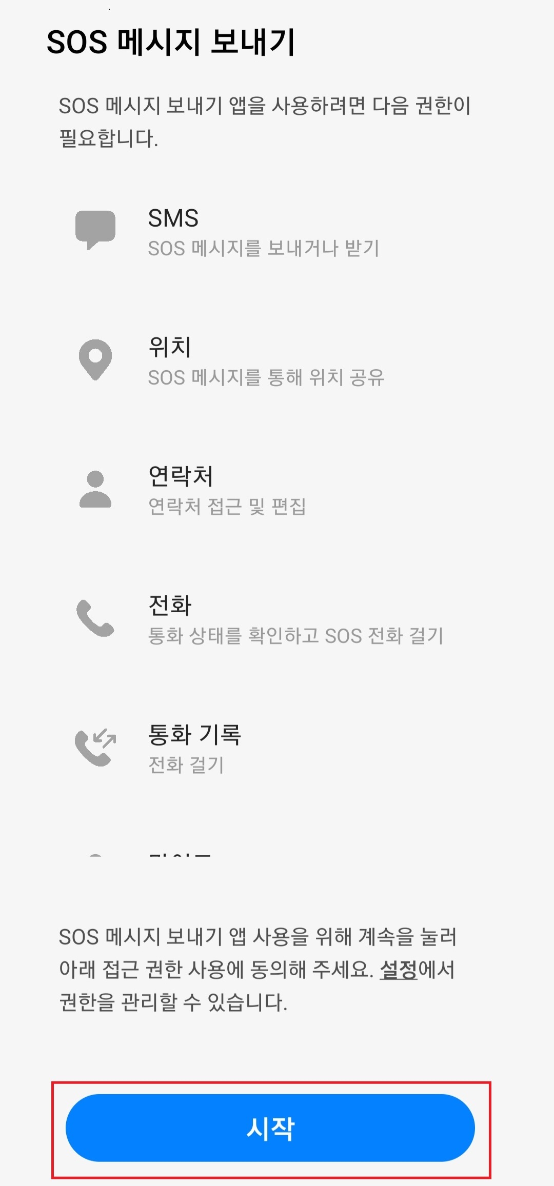 ▼ SOS 메시지 보내기 [사용 안 함]이라고 되어 있는 걸 활성화시켜줍니다. 그다음 SOS 메시지 보내기 기능에 대한 SMS, 위치, 연락처, 전화, 통화 기록 등등 접근 권한 사용에 대한 권유 동의를 눈으로 확인을 해주세요. 그다음 SOS 메시지 보내기 기능을 사용하기 위해 [시작] 버튼을 클릭해주시면 됩니다.