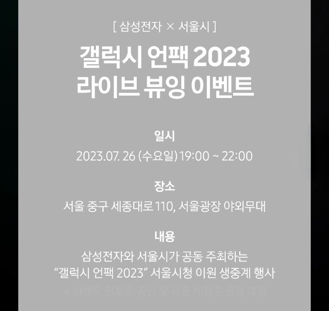 라이브 뷰잉 이벤트는 2023년 07월 26일 (수요일) 오후 7시에서 오후 10시까지 진행하고 장소는 서울 중구 세종대로 110, 서울광장 야외무대에서 진행한다고 합니다. 이벤트 전후로 공연 및 제품 체험존도 운영한다고 하네요. 만약 직접 방문이 어렵다면 삼성닷컴에서 갤럭시 언팩 2023을 오후 8시부터 생방송으로 볼 수 있다고 합니다.