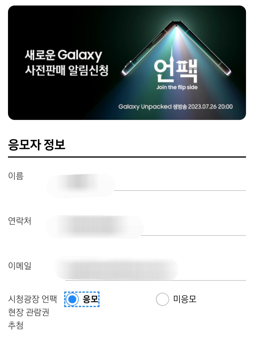 이벤트 응모 기간은 2023년 7월 6일부터 2023년 7월 14일 오후 5시까지 신청할 수 있는데요. 이벤트 응모를 하면 시청광장 언팩 현장 관람권을 추첨을 통해 드린다고 합니다. 갤럭시 언팩 2023 이벤트 응모하는 방법은 간단합니다.