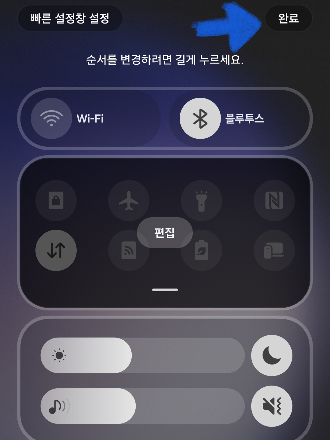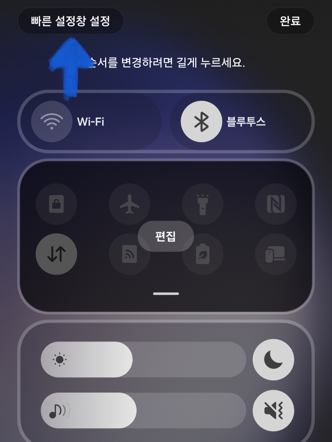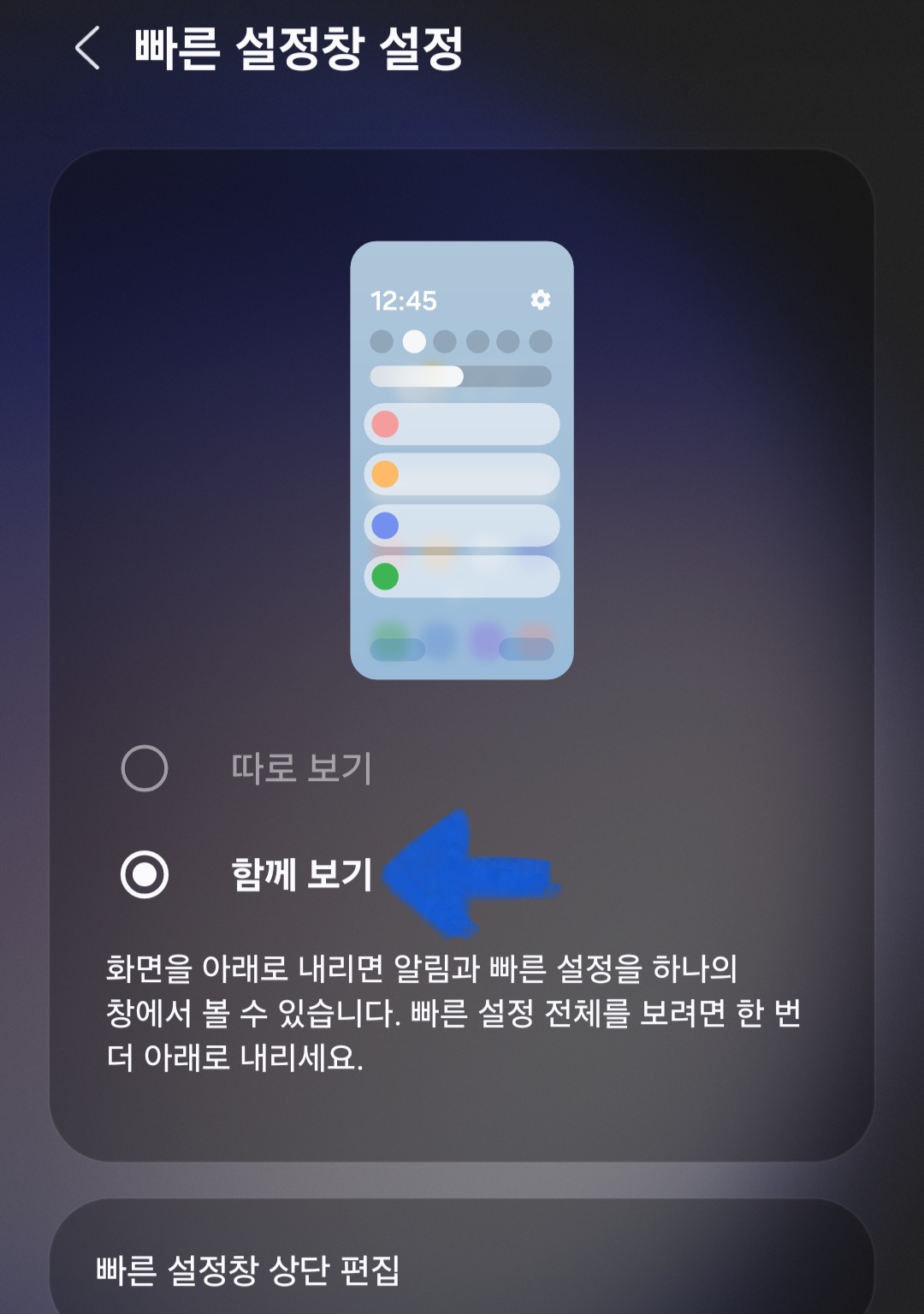 ▼그다음 왼쪽 상단에 [빠른 설정창 설정]을 클릭한 다음 따로 보기에서 [함께 보기]를 클릭 후 [완료]만 클릭해 주면 끝!!! (그 외 설정 순서도 바꿀 수 있답니다.)