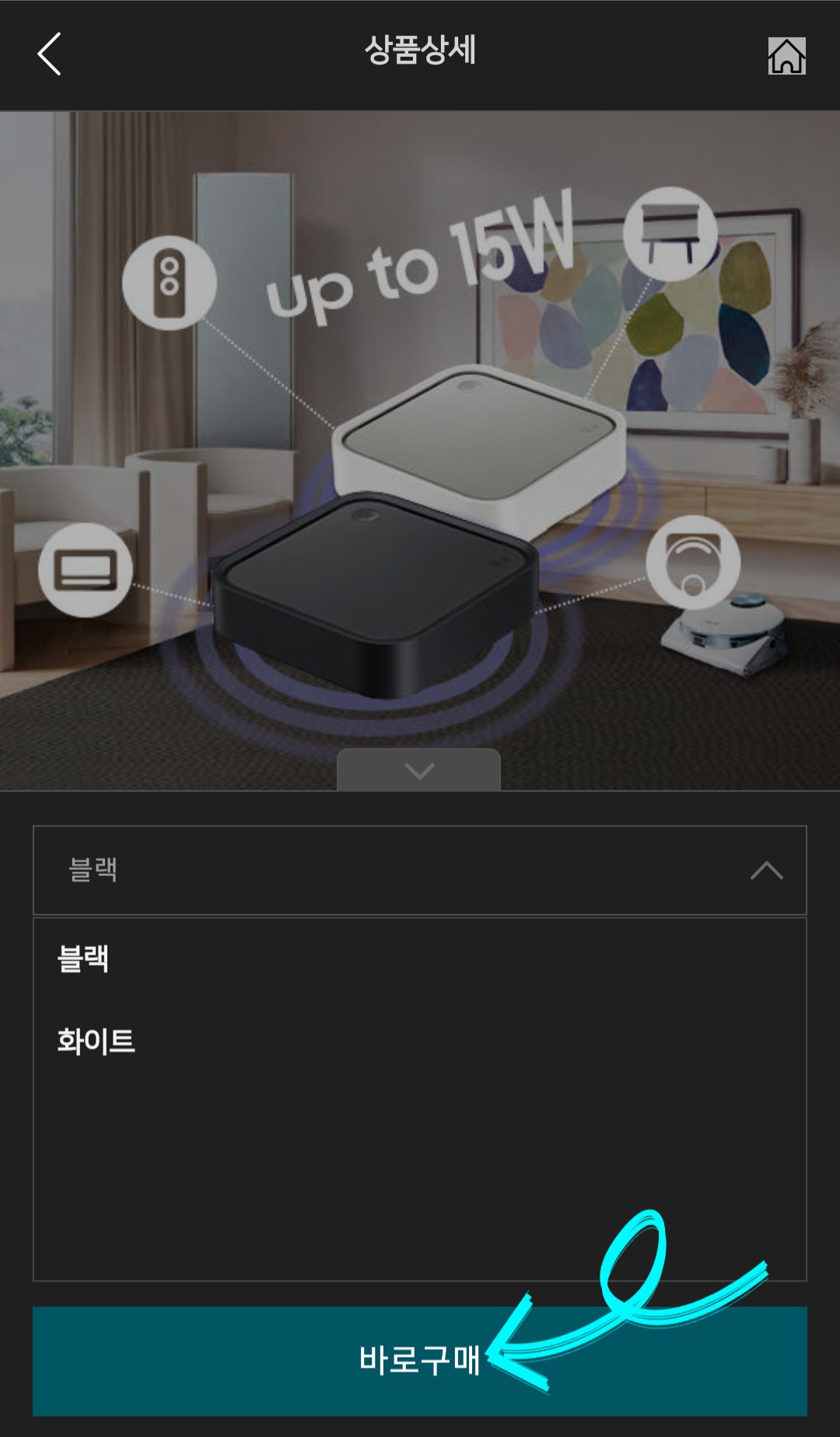 ▼핸드폰이나 버즈를 무선 충전할 수 있고 삼성 가전을 제어할 수 있는 스마트 싱스 스테이션 12만 9천 원짜리를 무료로 신청할 수 있었습니다. 저는 앞서 말씀드린 것처럼 스마트 싱스 스테이션이 더 끌려 선택 후 [구매하기]를 클릭했고 그럼 색상은 [블랙 혹은 화이트] 중 선택할 수 있는데요. 저는 블랙 색상으로 선택하고 [바로 구매]를 클릭했습니다.