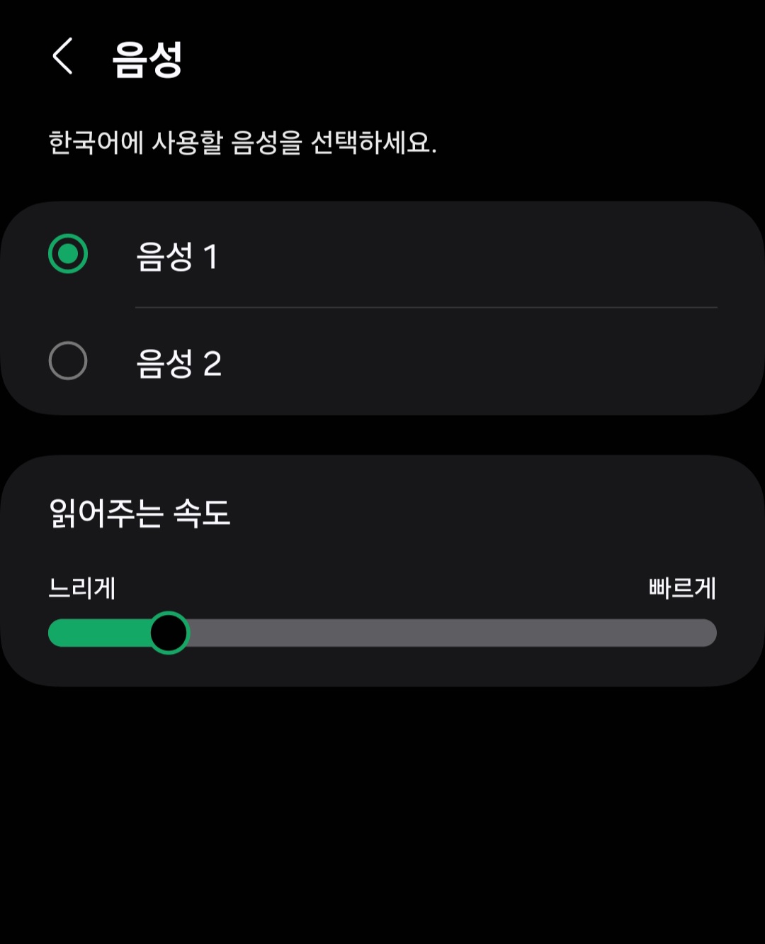 나 혹은 상대방 [음성]을 클릭하면 음성 1, 음성 2를 설정할 수 있는데요. 음성 1은 여성 목소리, 음성 2는 남성 목소리로 바뀝니다. 그리고 읽어주는 속도 또한 느리게 혹은 빠르게 바꿀수도 있답니다.