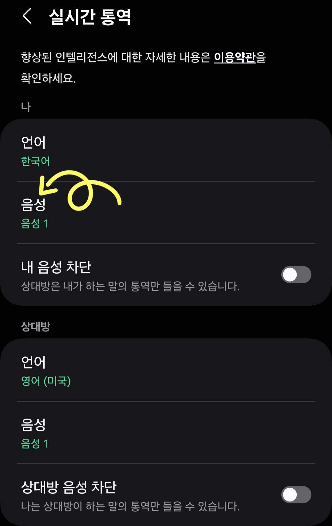 ▼마지막으로 [내 음성 차단] 기능을 활성화시켜 주시면 내가 하는 말 혹은 상대방이 하는 말의 통역만 들을 수 있는 기능이니 적절하게 사용해 보시길 바랍니다.