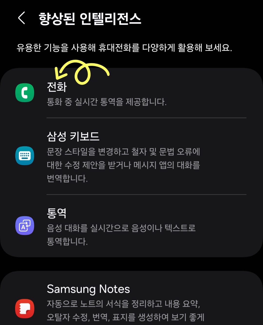 ▼그다음 [전화]를 클릭 후 실시간 통역이 Off 되어있는 걸 On으로 바꿔주시면 되는데요.