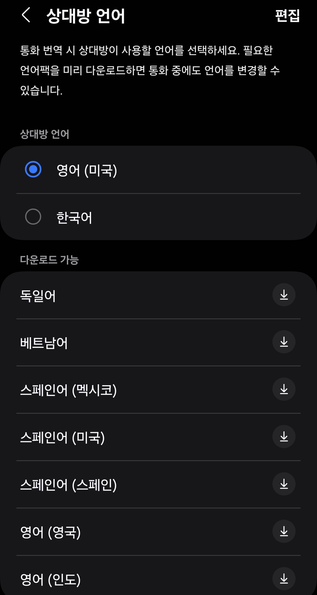 ▼그다음 나의 언어 선택, 상대방 언어 선택한 다음 다운로드 해주기만 하면 끝! 그럼 통화 중 실시간 통역 기능이 활성화됩니다.