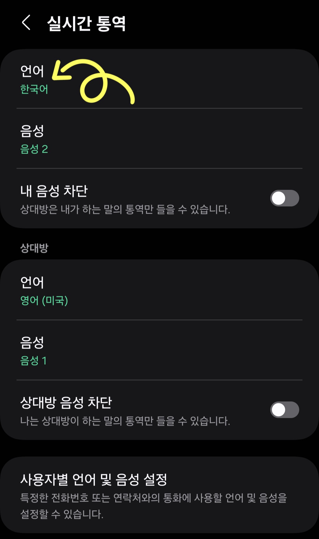 ▼그 외에도 [사용자별 언어 및 음성 설정]을 클릭하고 전화번호 또는 연락처를 추가해 상대방이 사용하는 언어로 저장할 수도 있습니다.