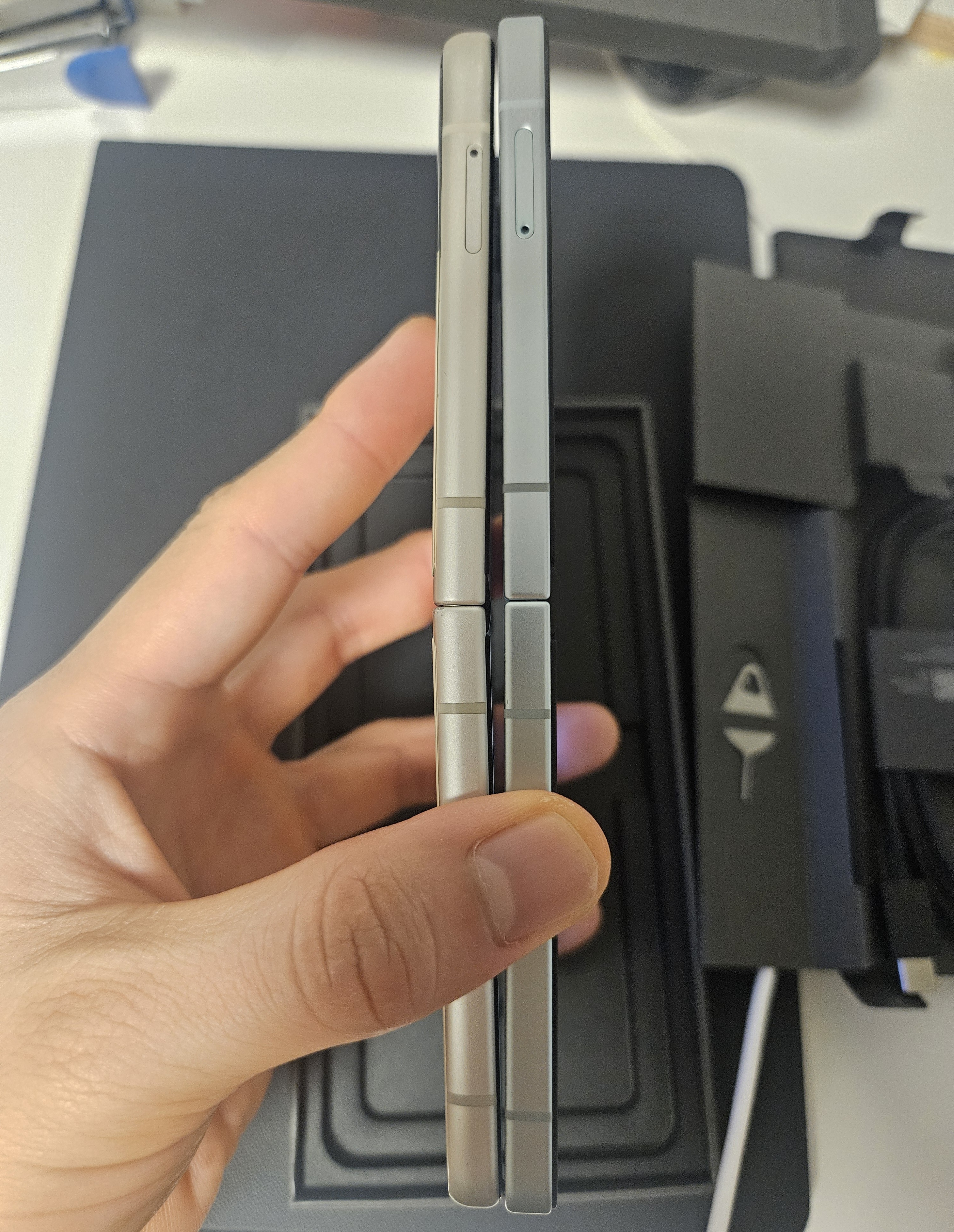 사용 중이던 Z플립3, Z플립7를 간단하게 비교해 보았는데요. 길이가 조금 더 길어지고 얇아졌고 볼록한 디자인에서 조금 각진 느낌으로 바뀌었더라고요.