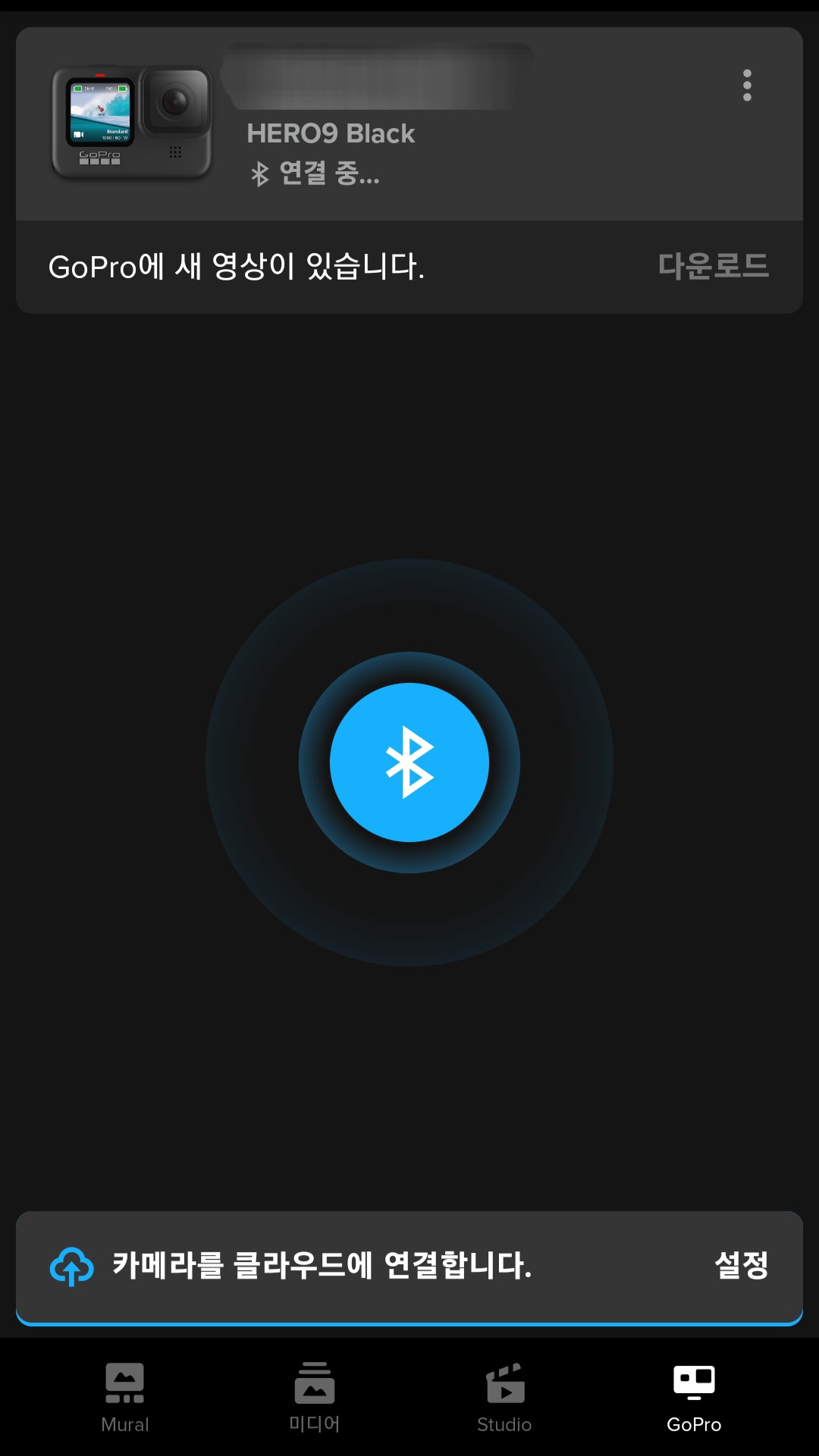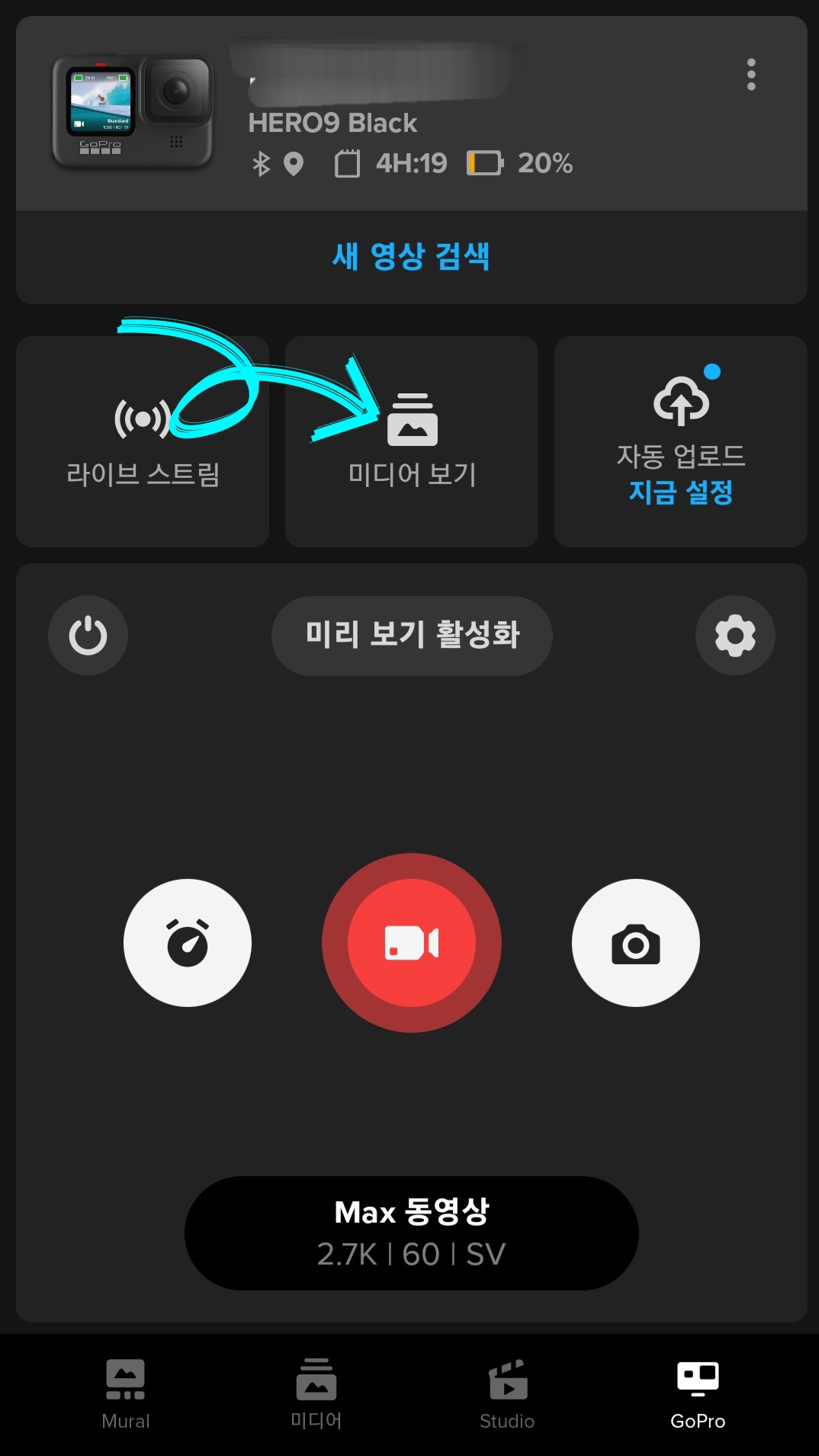 ▼그럼 블루투스 모양이 깜빡거리면서 핸드폰이랑 연동이 되고 고프로로 찍은 동영상을 보기 위해서 [미디어 보기]를 클릭해 줍니다.