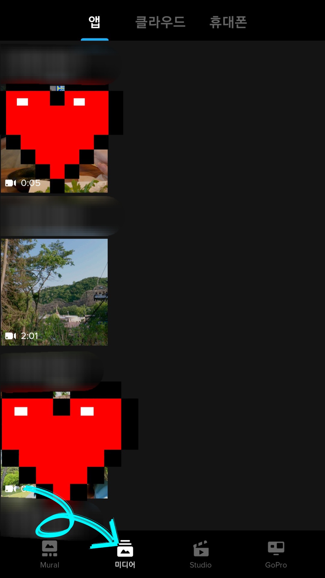 ▼이번엔 핸드폰 갤러리에 저장을 해볼까요? 우선 [Guik 어플]을 실행하고 하단에 [미디어]를 클릭하면 위 내용을 따라하셨다면 고프로 앱을 통해 다운로드한 동영상들이 있을 겁니다. 다운로드 한 동영상 중 핸드폰 갤러리로 저장하고 싶은 동영상을 클릭 후 상단에 있는 [오른쪽 가리키는 화살표]를 클릭해 줍니다.