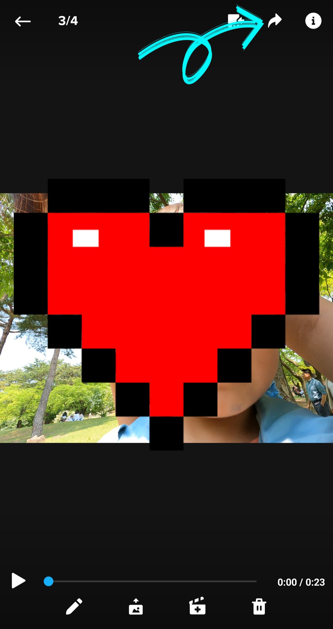 ▼그다음 고프로로 촬영한 마음에 드는 동영상을 하나 클릭한 다음 하단에 있는 기능 중 [아래를 가리키는 화살표 모양]을 클릭해 줍니다.
