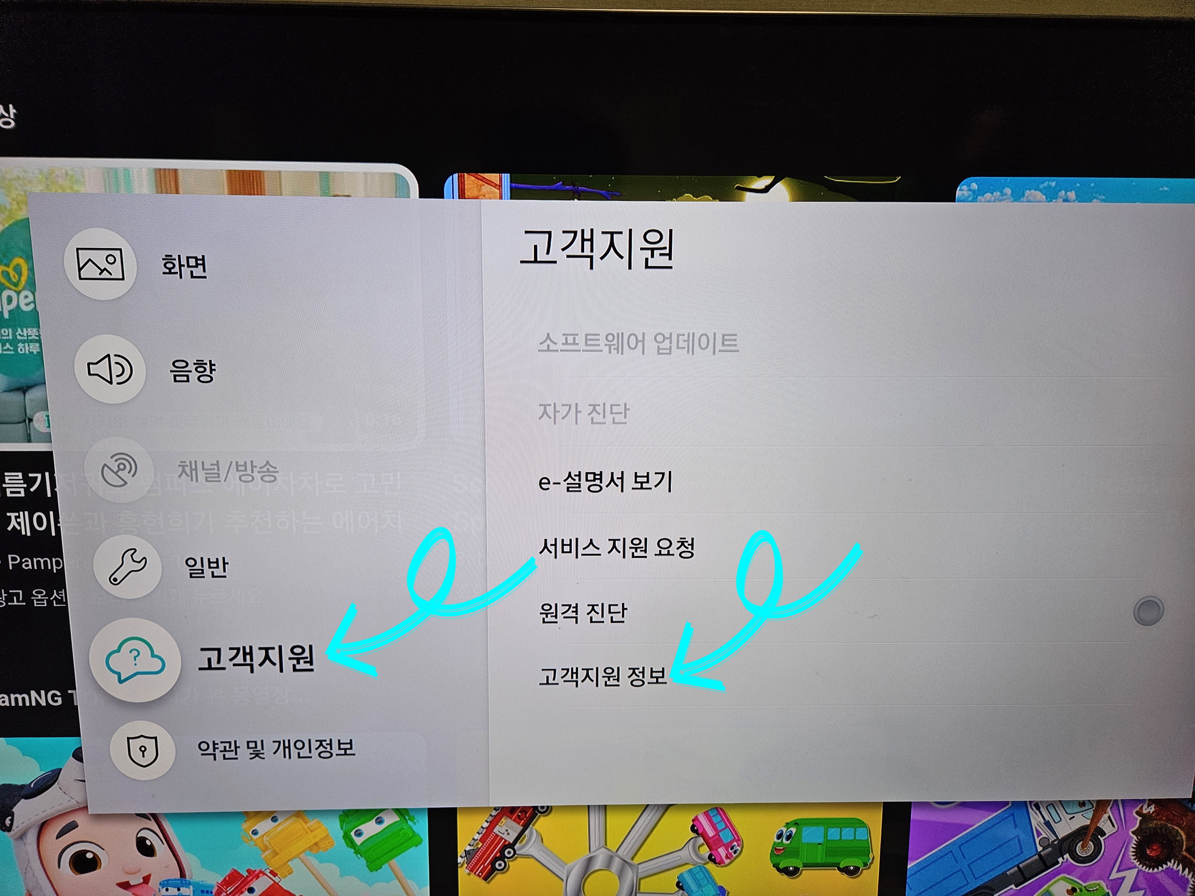 ▼위에 있는 방법은 도저히 안 되겠다면 우선 TV 전원을 켠 다음 리모컨을 이용해 TV 설정으로 넘어가줍니다. 그다음 [고객지원]을 클릭하고 [고객지원 정보]를 클릭해 주세요.