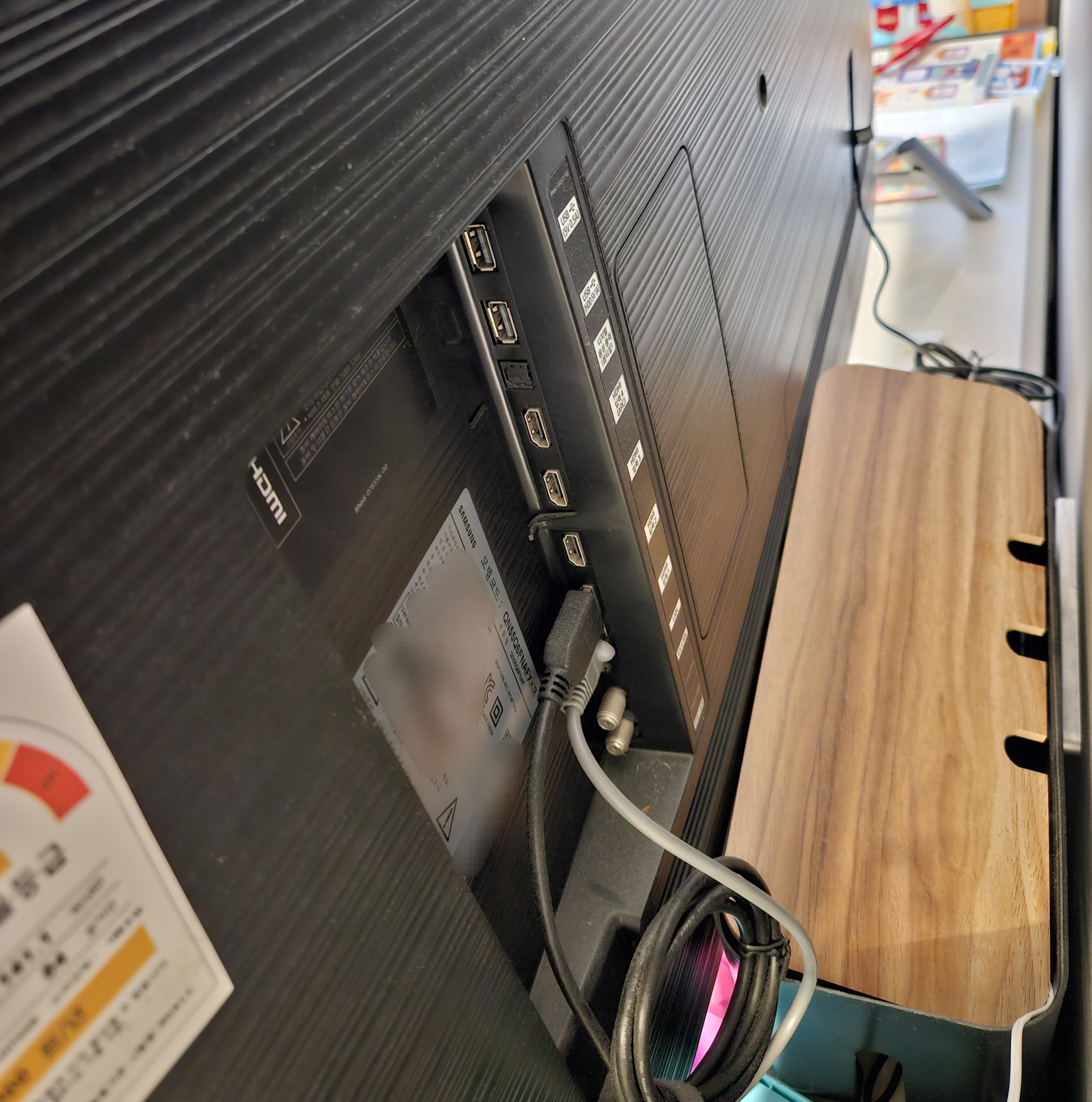 ▼TV 모델명을 알기 위해서 가장 쉬운 방법으론 삼성 TV 후면을 보면 다양한 단자 꽂는 곳에 스티커가 하나 부착되어 있는 걸 확인할 수 있습니다. 그 부착되어 있는 스티커를 자세히 보면 제품 모델명이 적혀있는데요.