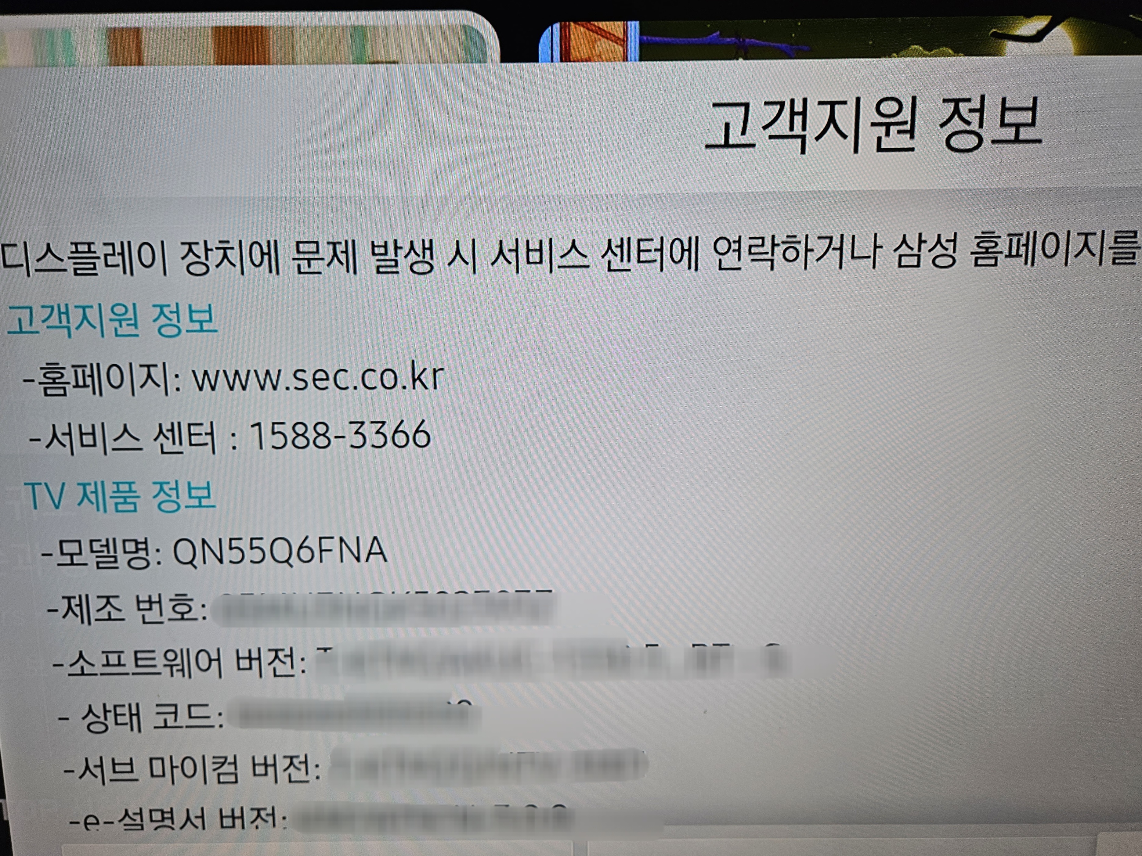주의사항으로 간혹 TV 후면에 부착되어 있는 스티커 모델명이랑 TV 설정으로 보는 모델명이 조금 다를 수 있는데요. 예시로 위에 있는 이미지 사진을 자세히 보시면 TV 후면에 부착되어 있는 스티커에는 QN55Q6FNAFXKR라고 써져 있고 TV 설정으로 확인한 모델명 QN55Q6FNA라고 써져 있는 걸 확인할 수 있습니다. 이건 다른 제품이 아닌 동일 제품이니 걱정 안 하셔도 됩니다. QN55Q6FNA 외에 추가로 써져 있는 영문 FXKR은 판매 국가가 한국을 뜻하는 것이니 다시 한번 크게 걱정 안 하셔도 됩니다. 감사합니다.