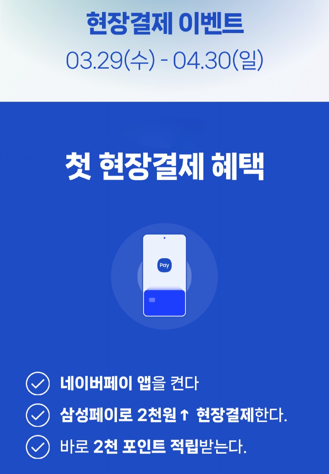 ▼그리고 네이버페이를 이용해 삼성페이 현장결제를 처음 사용하면 바로 2천 원 네이버포인트도 적립됩니다. 이 혜택은 2023년 3월 29일(수)부터 2023년 4월 30일(일)까지라고 하니 빨리 꼭 네이버 포인트 2천 원 혜택 받으세요.