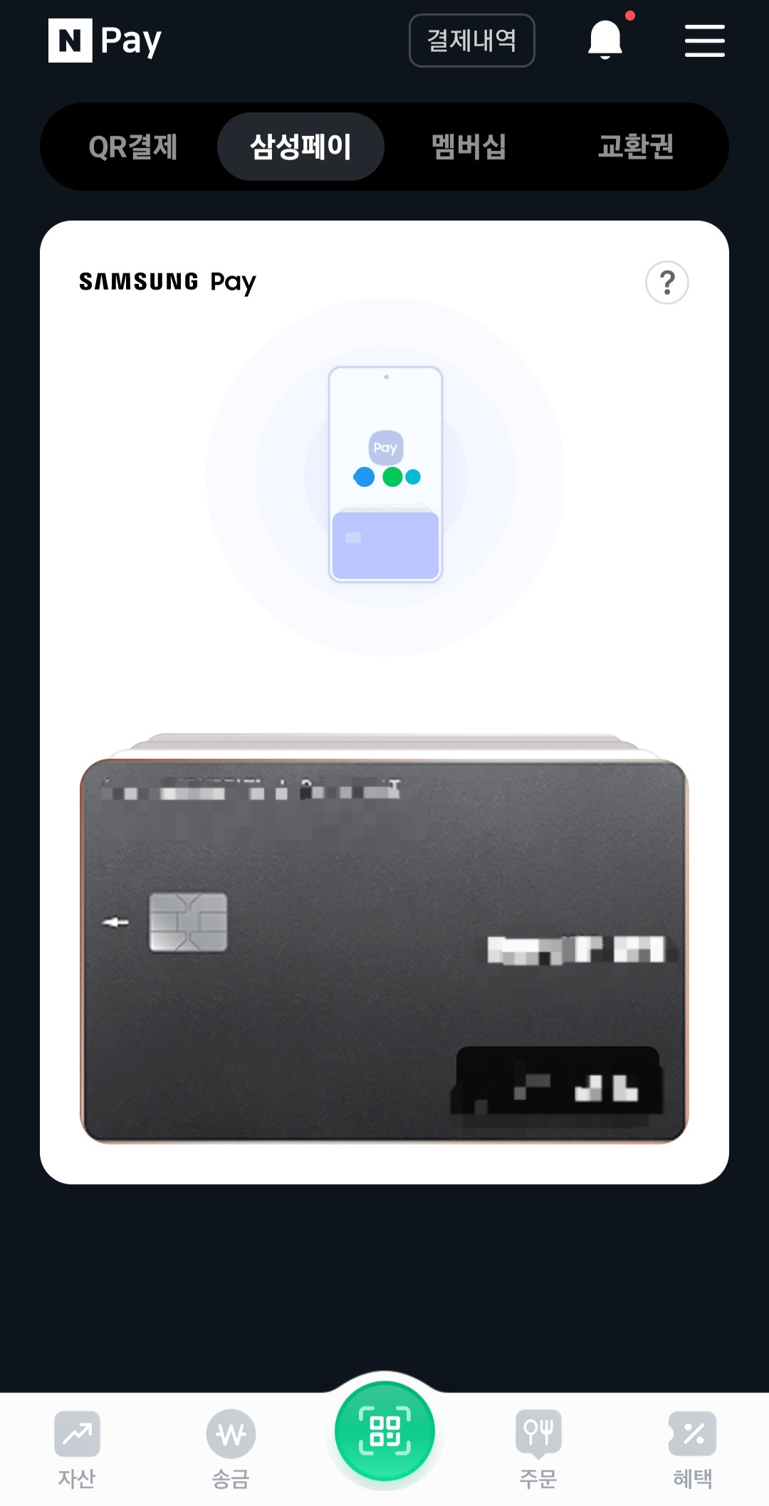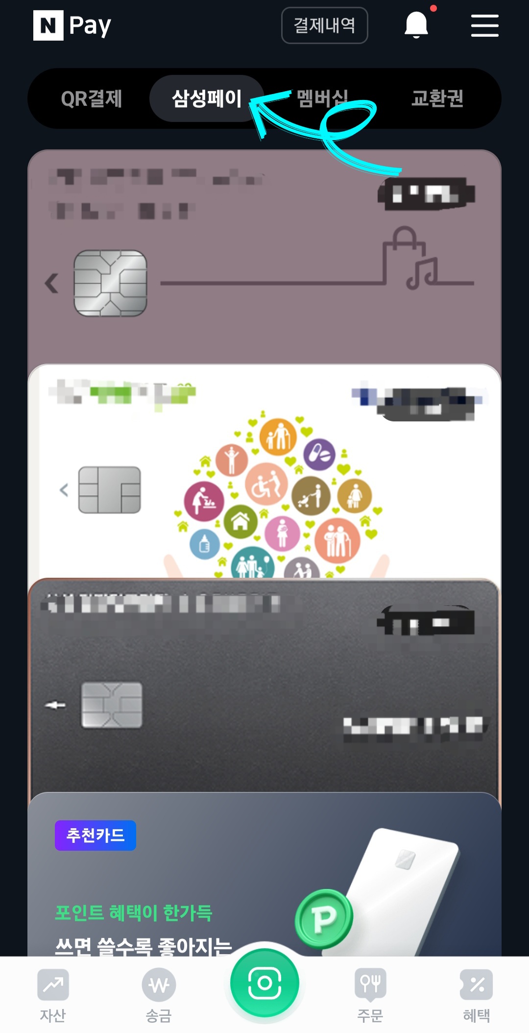 ▼그럼 네이버페이앱 상단에 [삼성페이]이라는 란이 새롭게 생긴 게 보일 겁니다. 그럼 삼성페이를 클릭하고 등록되어 있는 카드를 선택해 현장결제 해주면 되는데요.*주의사항은 삼성페이에 등록되어 있는 카드가 아닌 네이버페이에 등록한 카드정보가 네이버페이앱에 있는 삼성페이에 뜹니다.
