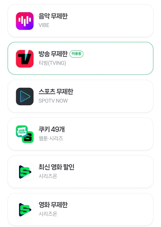 ▼세 번째로 다양한 콘텐츠 선택입니다. 음악 무제한[VIBE], 방송 무제한[티빙], 스포츠 무제한[SPOTV NOW], 쿠키 49개[웹툰, 시리즈], 최신 영화 할인 혹은 영화 무제한[시리즈온] 중 하나를 선택해 콘텐츠를 즐길 수 있어 좋더라고요.