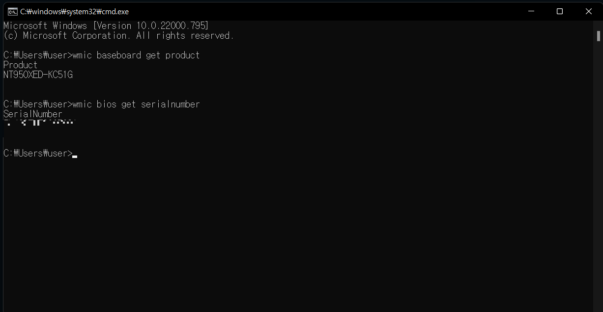 ▼명령 프롬프트를 실행시킨 다음 [wmic baseboard get product]을 입력하면 모델명, [wmic bios get serialnumber]을 입력하면 시리얼 넘버 이것만 기억하고 있으면 제품에 스티커가 부착이 안되어 있어도 혹은 각인되어있는 글씨가 지워졌어도 제품 모델명 및 시리얼 번호 확인할 수 있습니다.