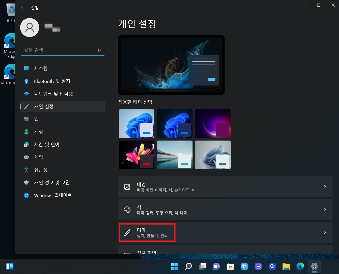 더 많은 옵션 표시를 클릭하셨다면 바로 "개인 설정"이 뜨는데 그걸 클릭한 다음 개인 설정창이 뜨는데 거기서 "테마"를 찾아 클릭해줍니다.