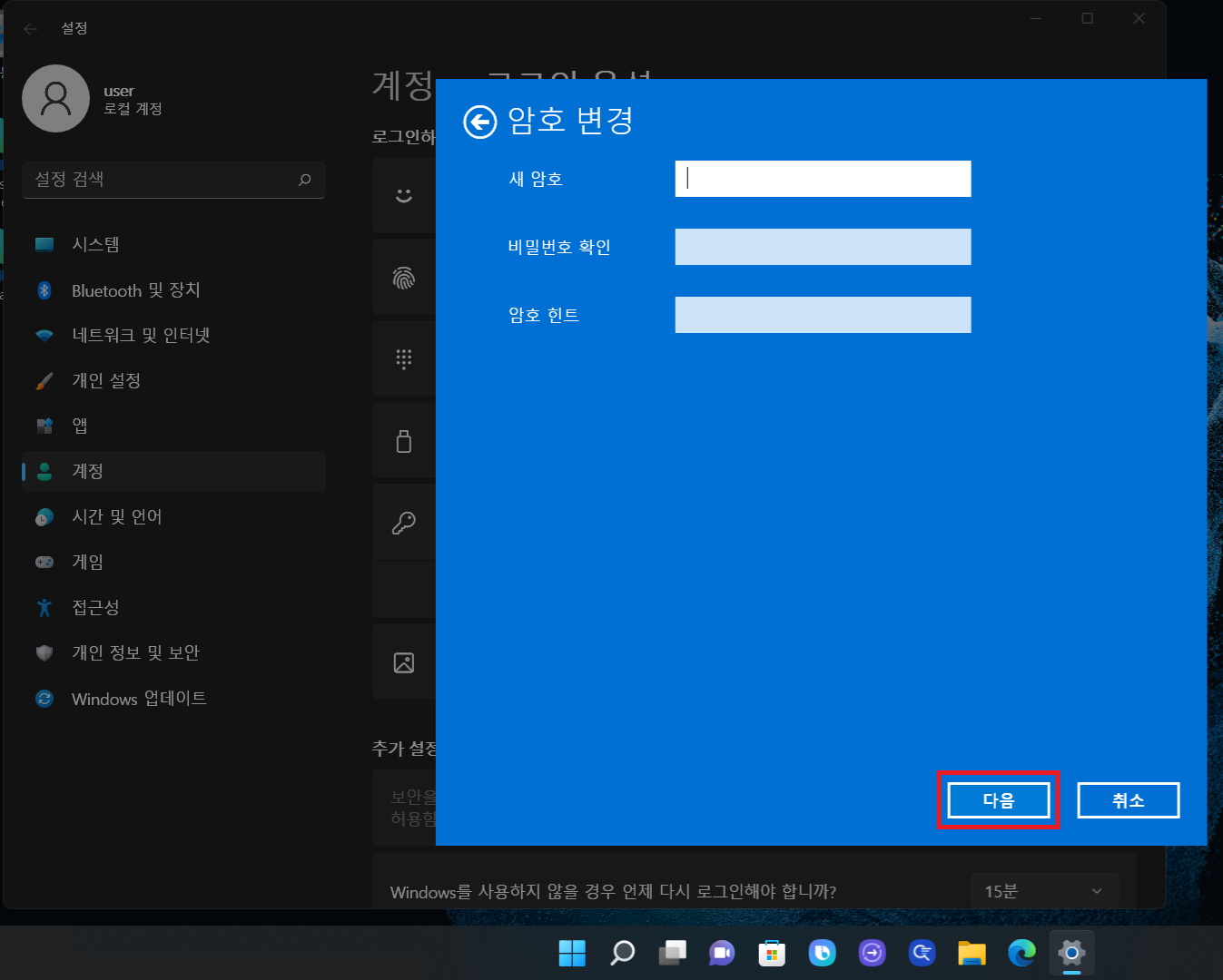 그다음 현재 사용 중인 비밀번호를 입력하고 다음을 클릭해줍니다.