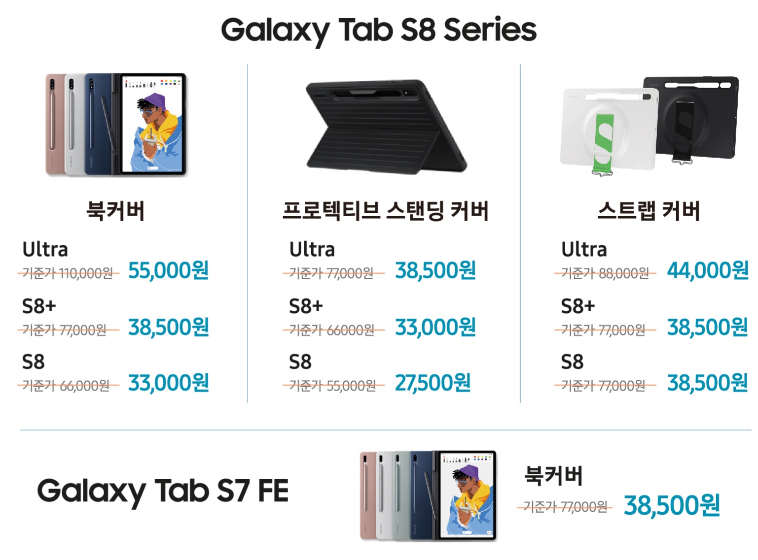 이번 갤럭시 탭 여행엔 탭 하나 프로모션은 갤럭시 탭 S8 시리즈랑 갤럭시 탭 S7 FE 모델 구매한 분들한테만 북 커버 50% 할인 쿠폰을 증정해드린다고 합니다. 하지만 아쉬운 점이 있다면 키보드 커버 50% 할인 혜택은 없어졌다는 게 조금 아쉽긴 하지만 그래도 북 커버 50% 할인 혜택으로도 다시 받을 수 있어 다행이라고 생각합니다.