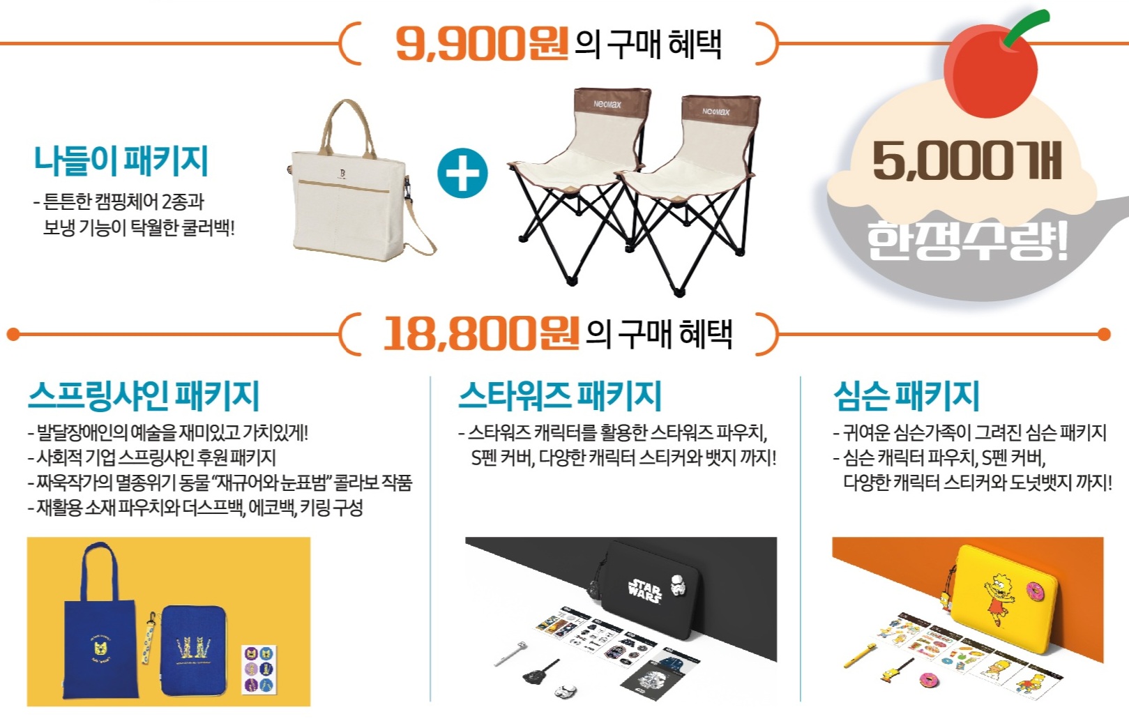 이번 여행엔 탭 하나 프로모션 중 캠핑을 좋아하는 분들이나 캠핑에 관심이 있으신 분들한테는 괜찮은 혜택이지 않을까 싶은데요 바로 나들이 패키지입니다. 튼튼한 캠핑체어 2종과 보냉 기능이 탁월한 쿨러백을 9,900원에 구매할 수 있기 때문입니다. 조금 아쉬운 점이 있다면 5,000개 한정 수량으로만 구매 가능하다는 점은 아쉽게 느껴지네요. 그리고 나머지 스프링 샤인 패키지, 스타워즈 패키지, 심슨 패키지 혜택 또한 저번이랑 동일하게 진행을 합니다.