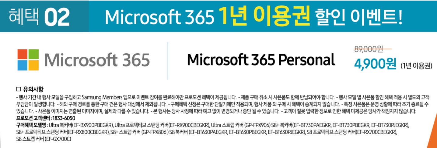 두 번째 혜택으로 마이크로소프트 365 1년 이용권 89,000원 상품을 1년 동안은 4,900원 할인받아서 이용할 수 있는 혜택도 있다고 합니다. 이 혜택은 저번이랑 동일합니다.