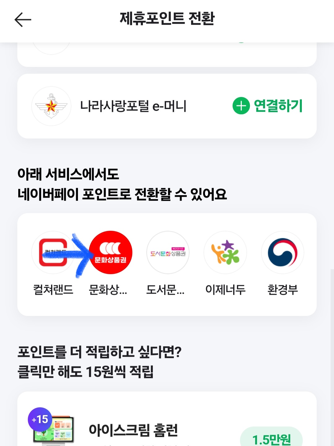 ▼그다음 [제휴포인트 전환]을 클릭 후 스크롤을 내리다 보면 네이버포인트로 전환할 수 있는 란이 뜨는데요. 그중 [문화상품권]을 클릭해 주세요.