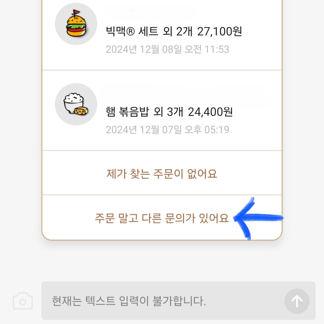 ▼그럼 최근 주문한 메뉴가 뜨면서 제일 하단에 [주문 말고 다른 문의가 있어요]라는 문구가 있을 겁니다. 그걸 클릭해 주세요.