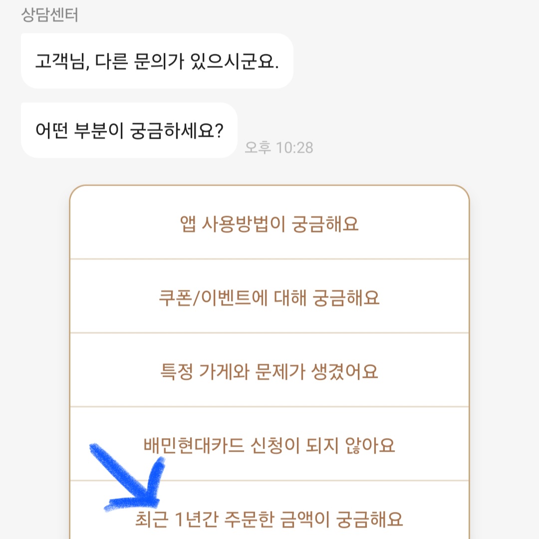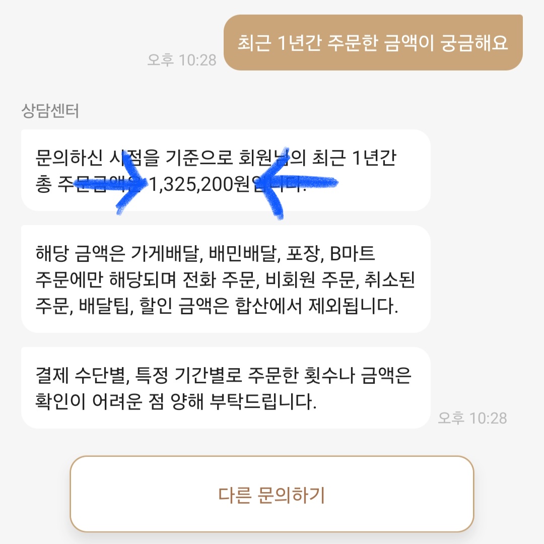 ▼그다음 [최근 1년간 주문한 금액이 궁금해요]를 클릭하면 최근 1년간 배달의민족으로 주문한 금액이 뜨는 걸 확인하실 수 있습니다.