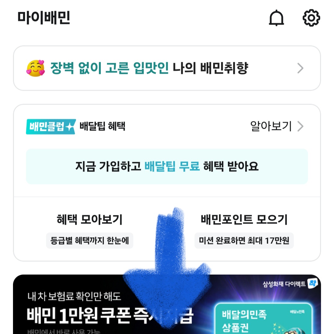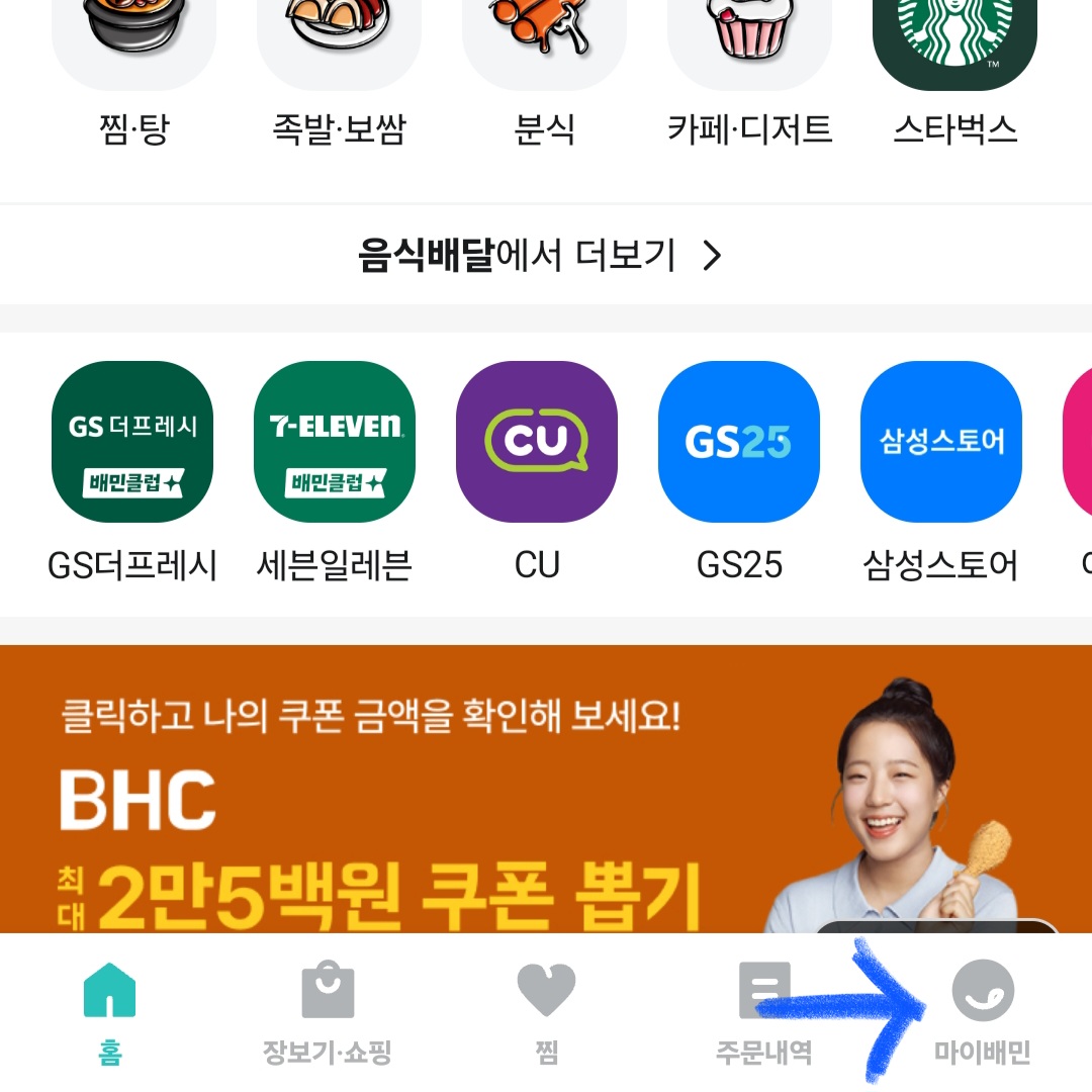 ▼우선 배달의민족앱을 실행한 후 하단 메뉴창에 있는 [마이배민]을 클릭해 주세요.