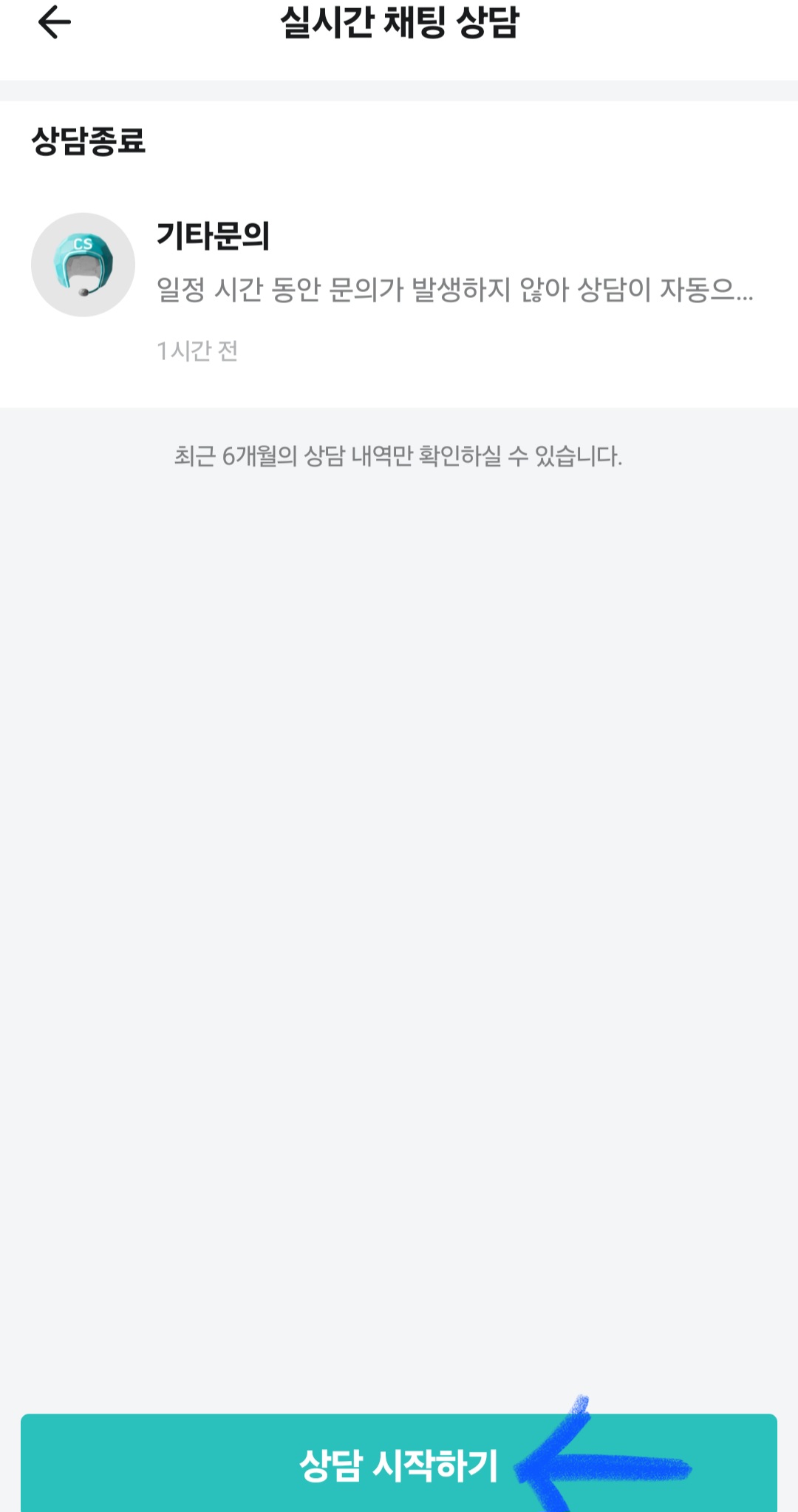 ▼그다음 [채팅상담]을 클릭하고 [상담 시작하기]를 클릭해 주세요.