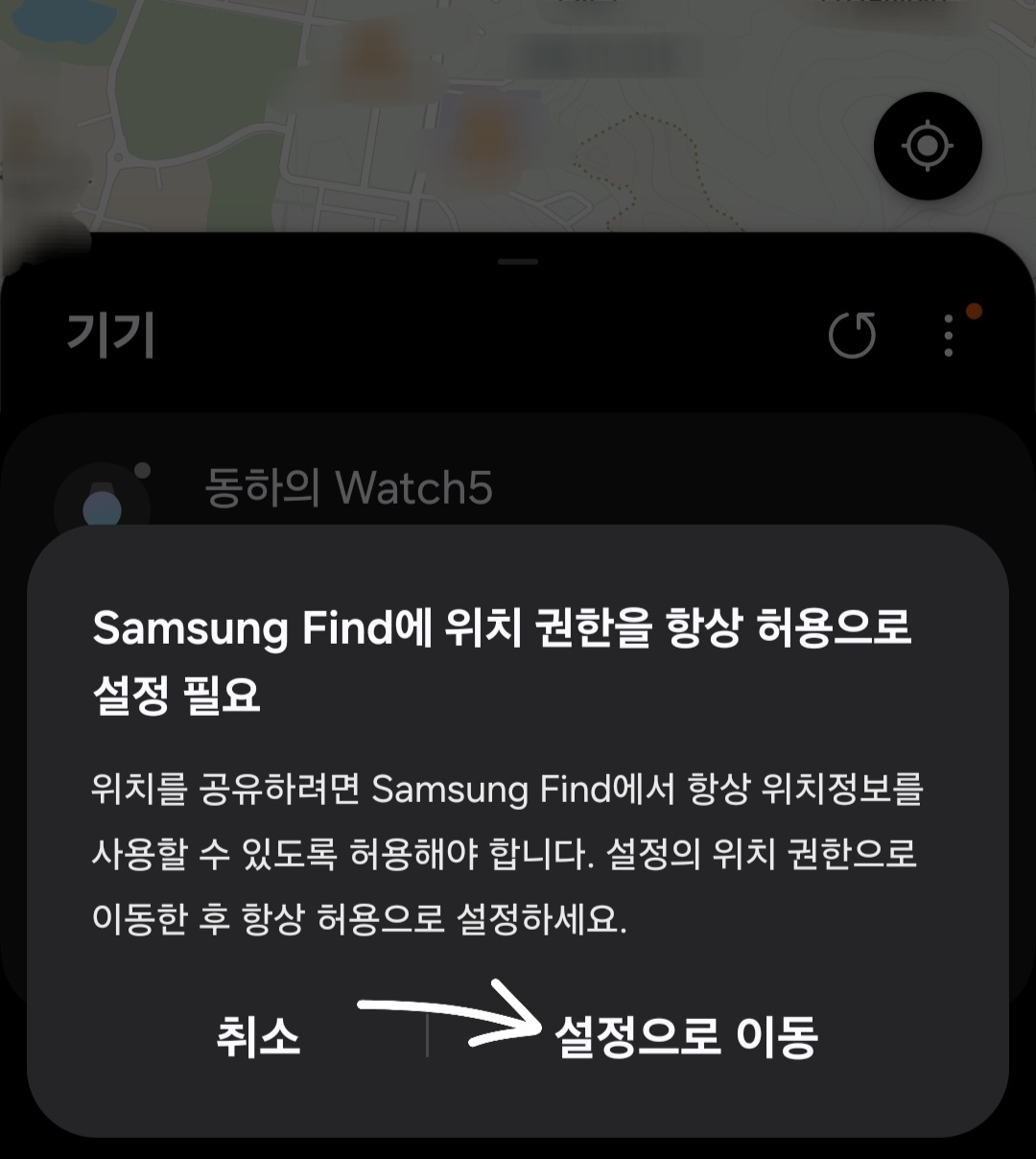 ▼Samsung Find앱을 실행하고 간단한 확인절차가 끝나면 밑에 있는 이미지처럼 뜰 수 있습니다. 그럼 [설정으로 이동]을 클릭 후 [항상 허용]으로 바꿔 주세요.