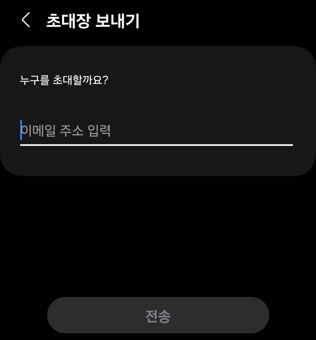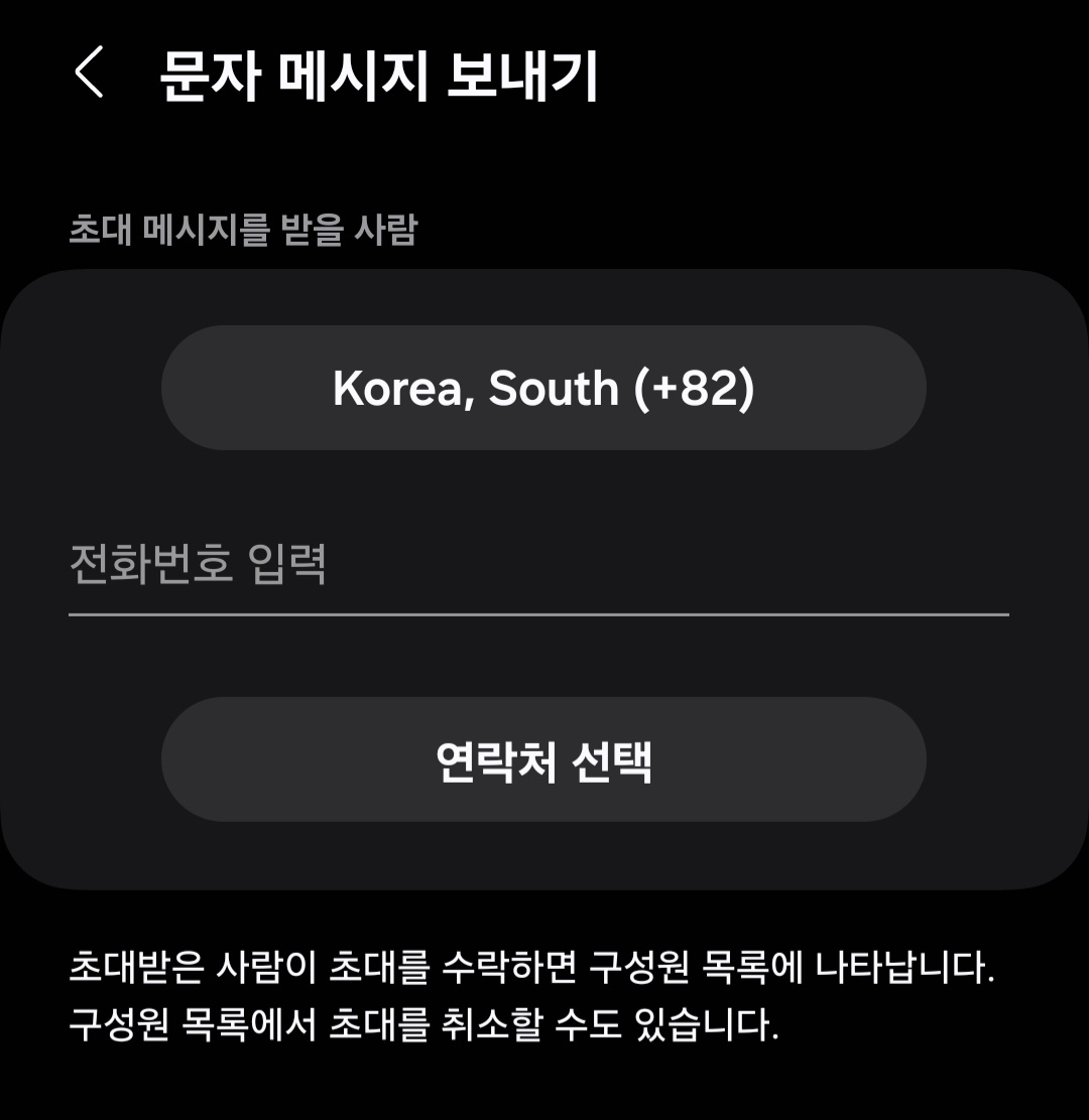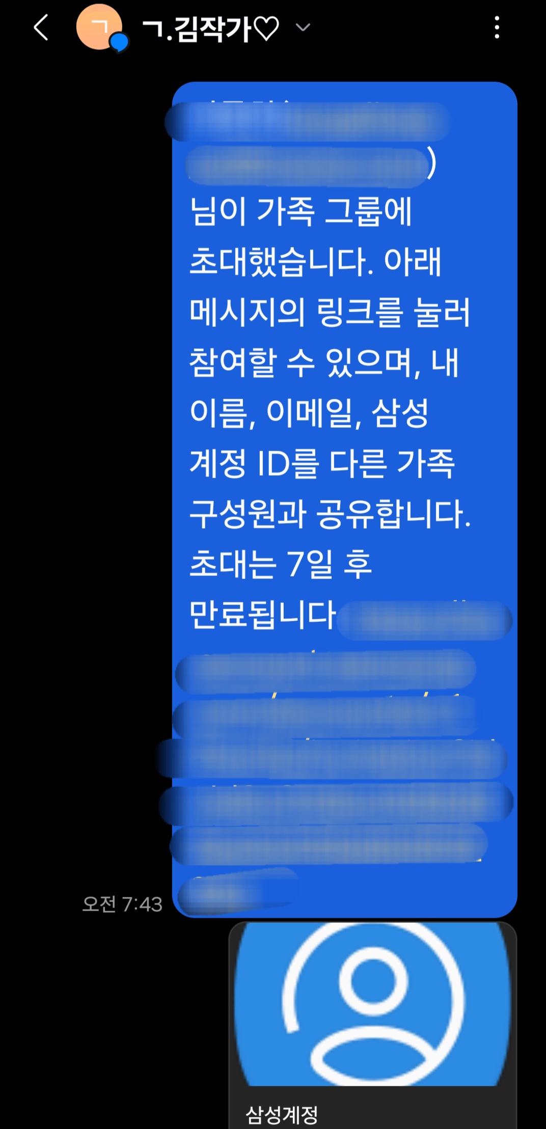 ▼저는 위에 있는 세 가지 방법 중 문자 메시지 보내기를 선택해 보았는데요. 그럼 밑에 있는 이미지처럼 해당 구성원한테 나의 삼성계정 이메일이랑 같이 링크가 전송됩니다.