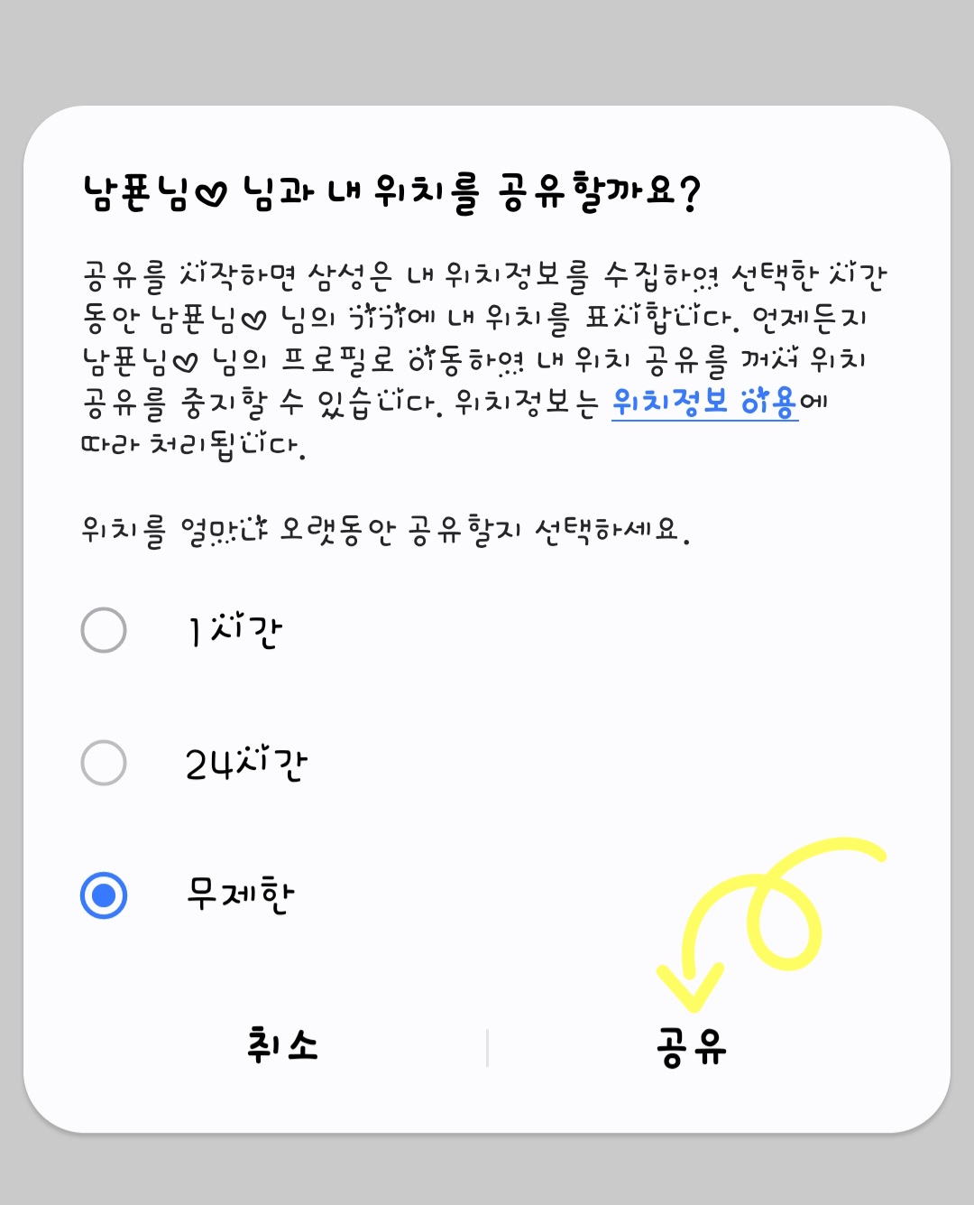 ▼다음으로 위치를 얼마나 오랫동안 공유할지 선택을 하고 [공유]를 클릭하면 내 핸드폰으로 수락설정이 옵니다. 그럼 가족끼리 위치 공유가 설정됩니다.
