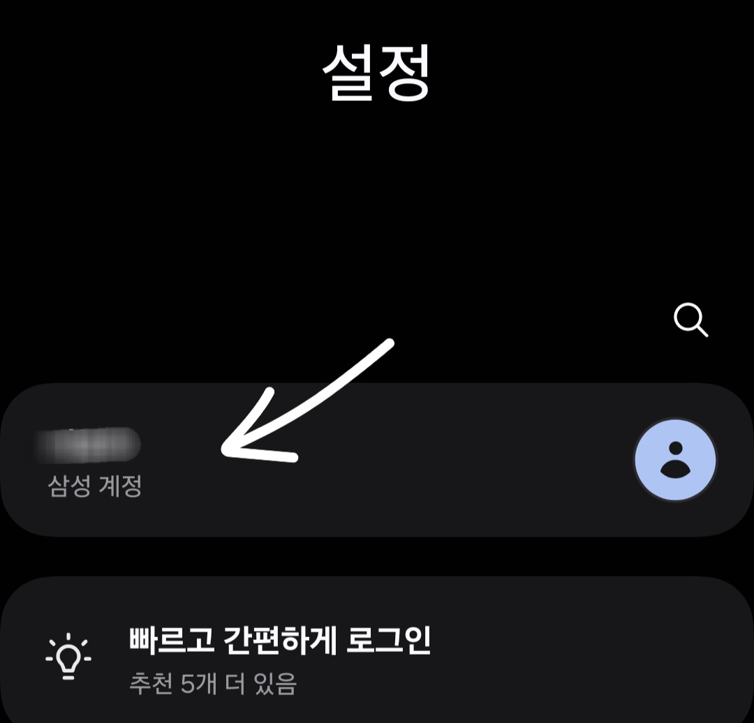 ▼우선 [빠른 설정창]을 활성화시킨 후 상단에 있는 [설정(톱니바퀴모양)]을 클릭해 줍니다. 그다음 [설정] 란에서 [삼성계정]을 클릭해 주세요.