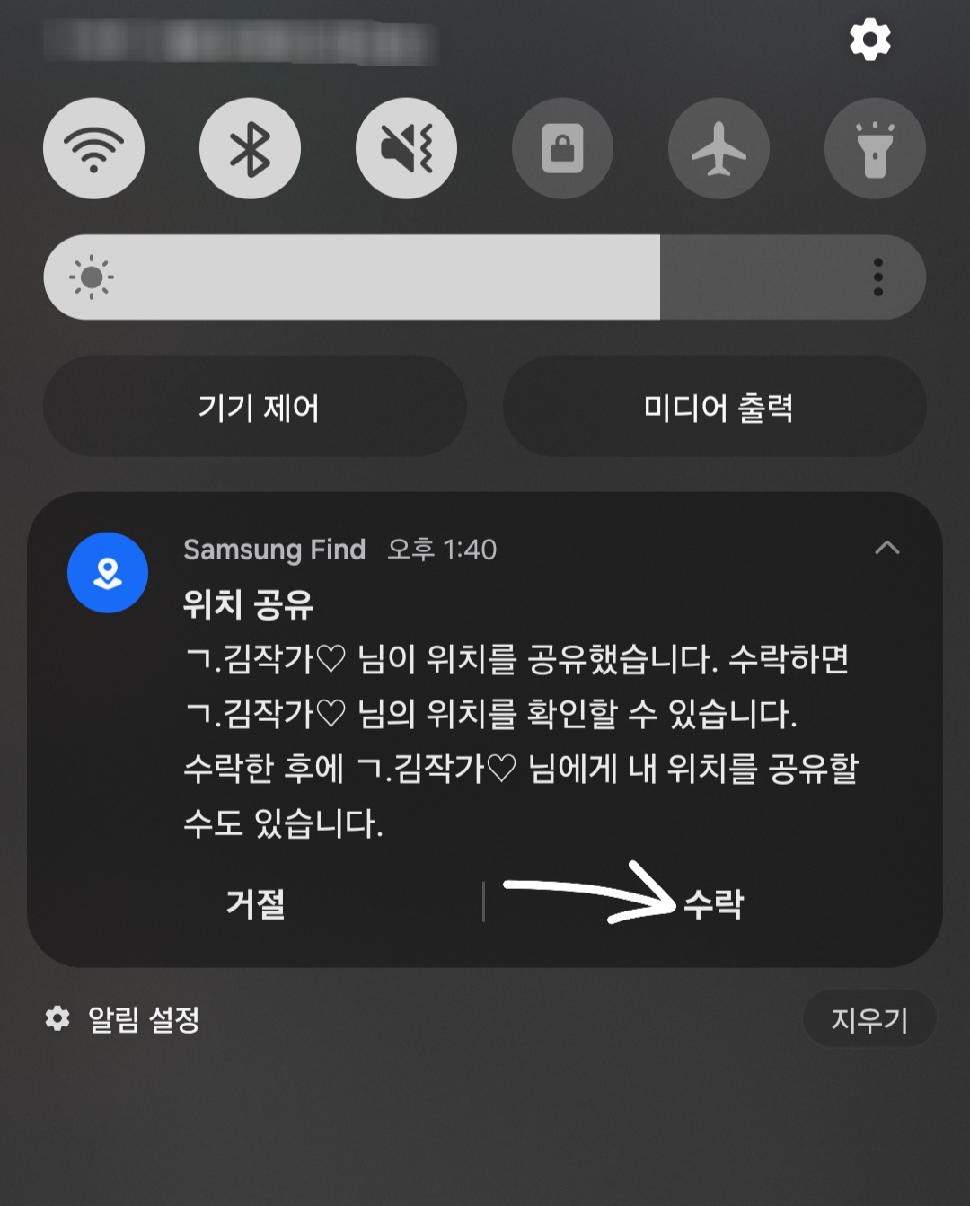 ▼다음으로 위치를 얼마나 오랫동안 공유할지 선택을 하고 [공유]를 클릭하면 내 핸드폰으로 수락설정이 옵니다. 그럼 가족끼리 위치 공유가 설정됩니다.