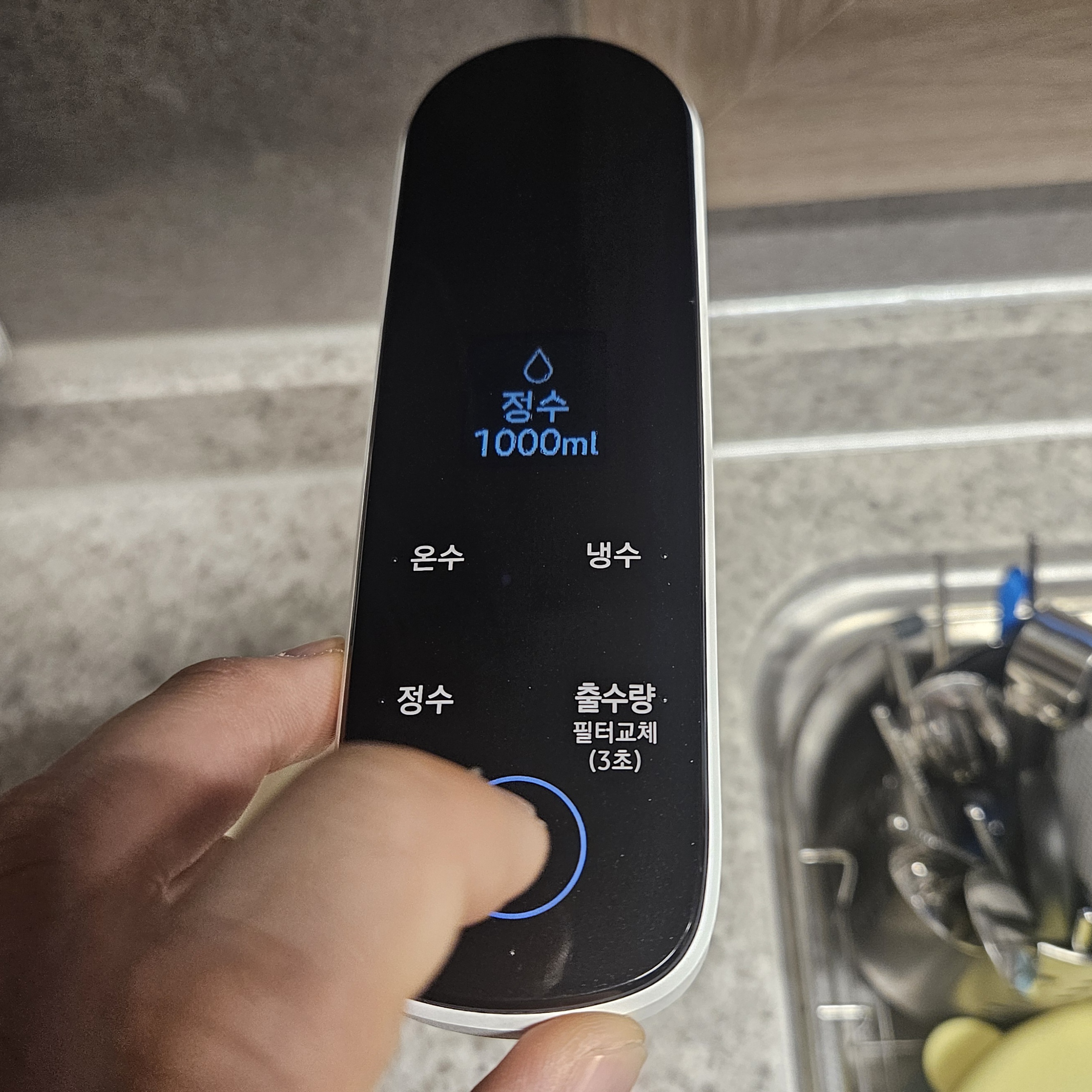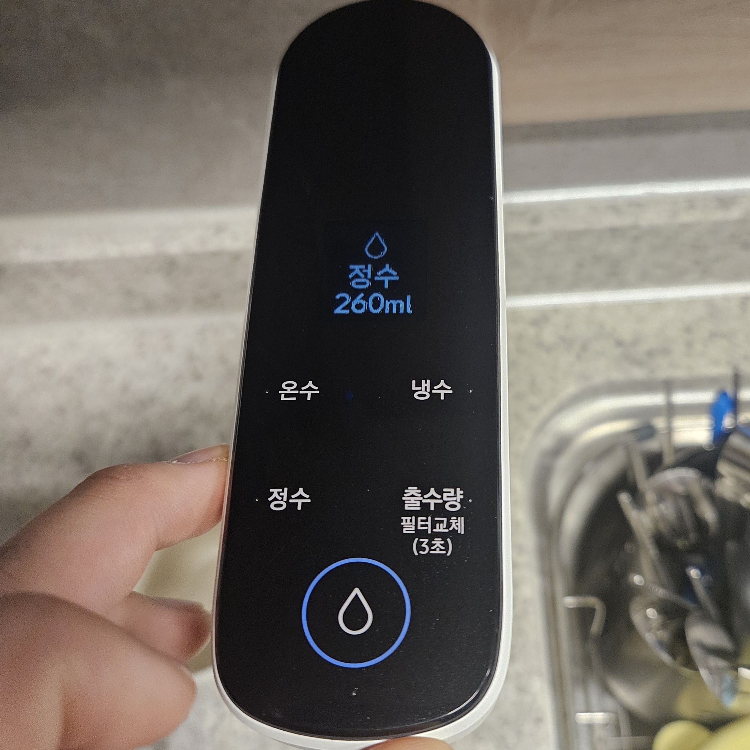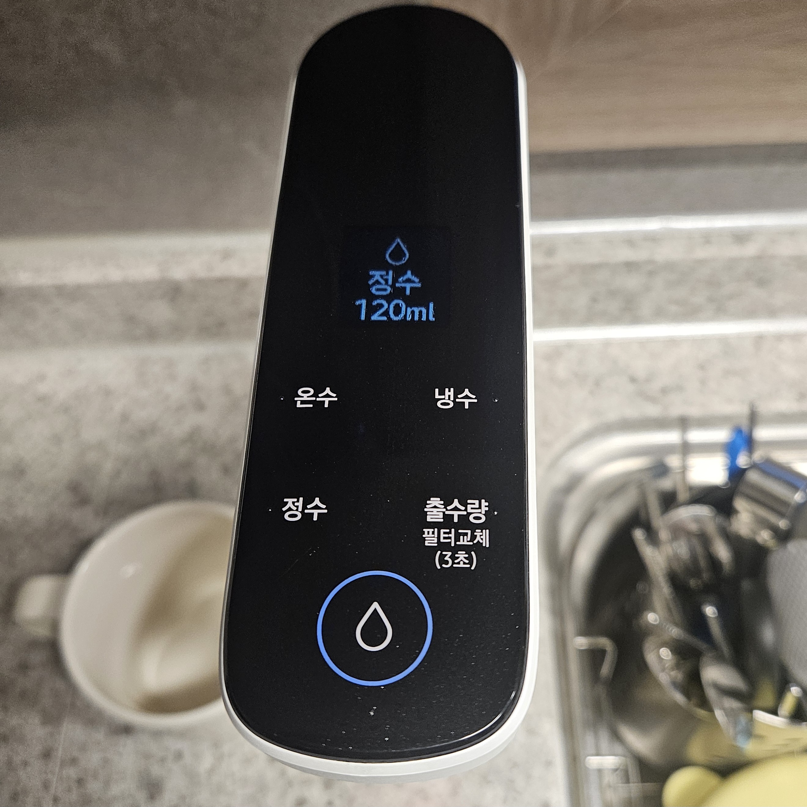 우선 제가 구매한 모델은 RWP54421BF7M 제품인데요. 정수, 온수, 냉수까지 모두 되는 제품입니다. 먹고 싶은 물을 선택 후 출수량을 정해주면 온도가 바뀌는데 삼성에서 설정해 놓은 기본 출수량은 120ml-260ml