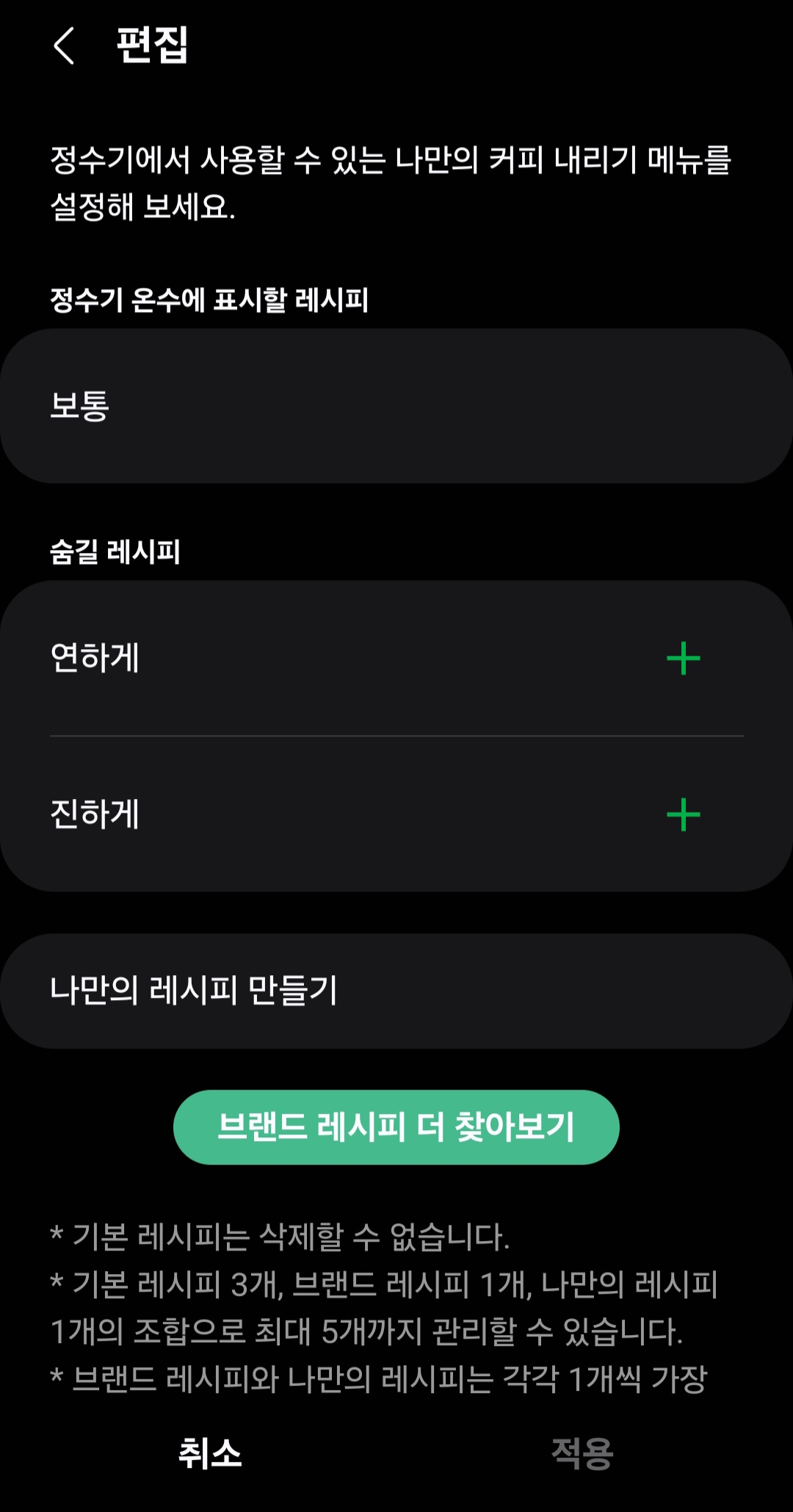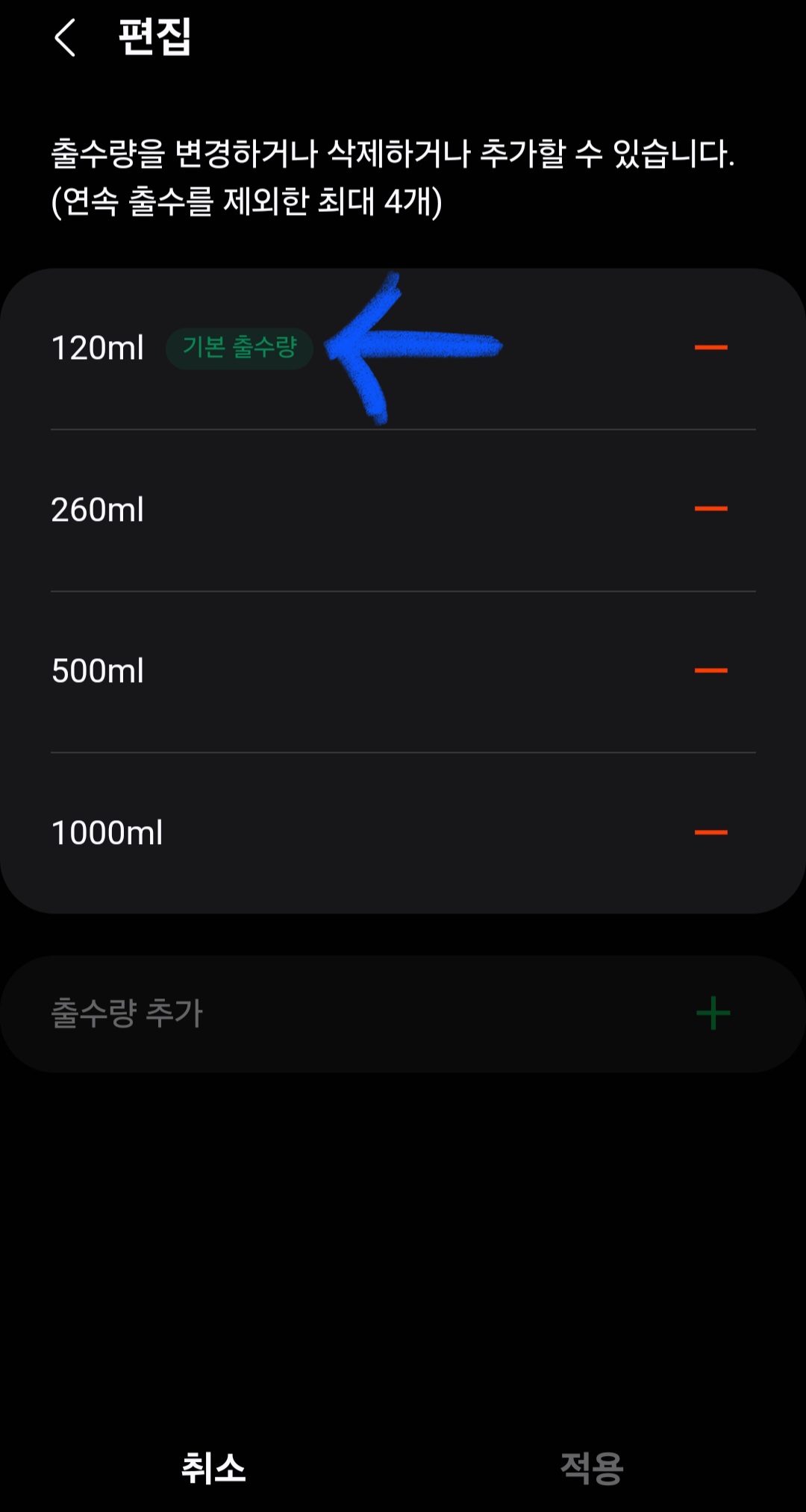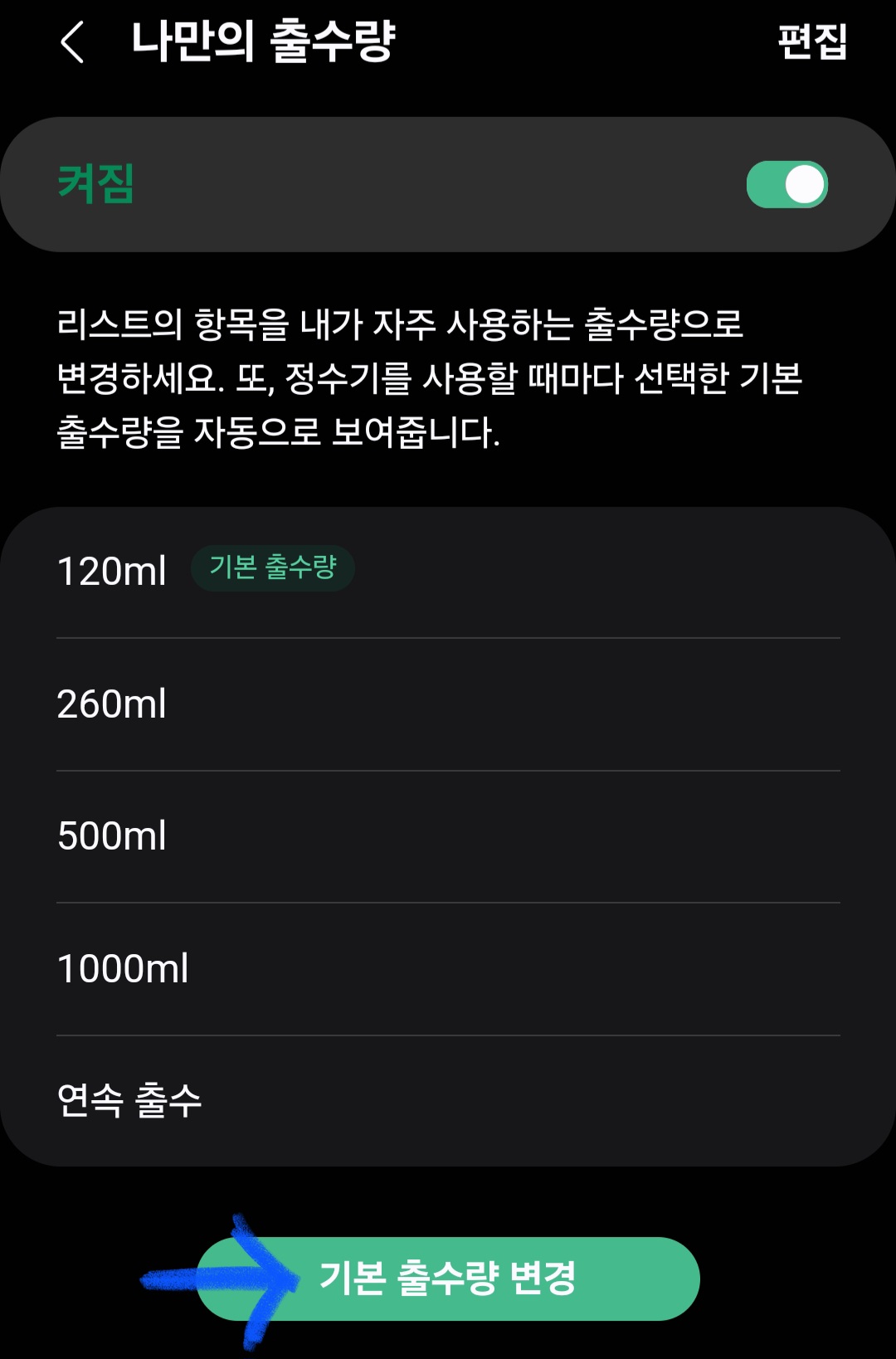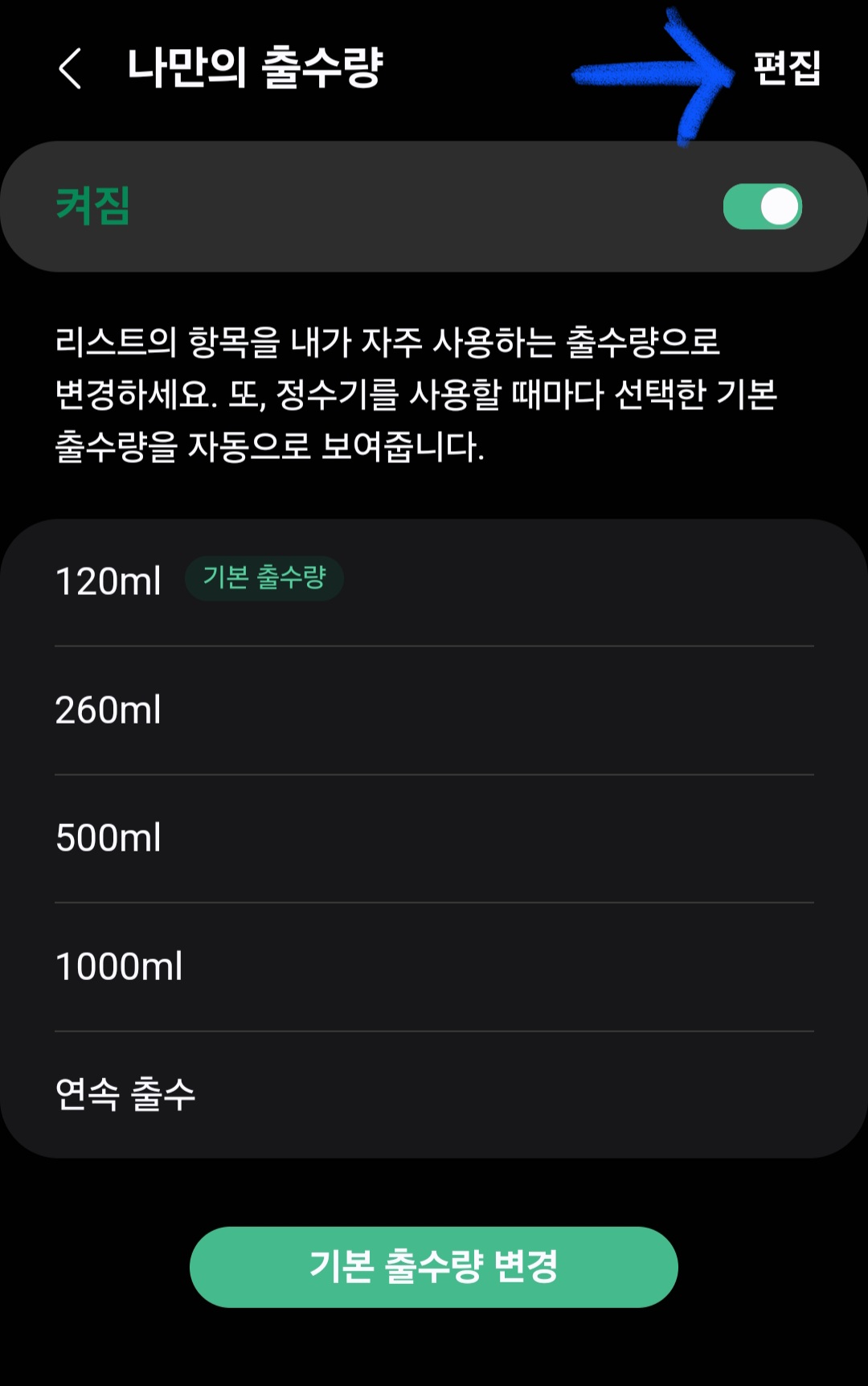 ▼만약 내가 원하는 출수량이 없다면 출수량도 바꿀 수 있는데요. 나만의 출수량에서 상단에 있는 [편집]을 클릭하고 바꾸고 싶은데 [출수량]을 클릭하면 50ml-1,000ml까지 10ml 단위로 변경할 수 있으니 나만의 출수량을 만들어보세요.