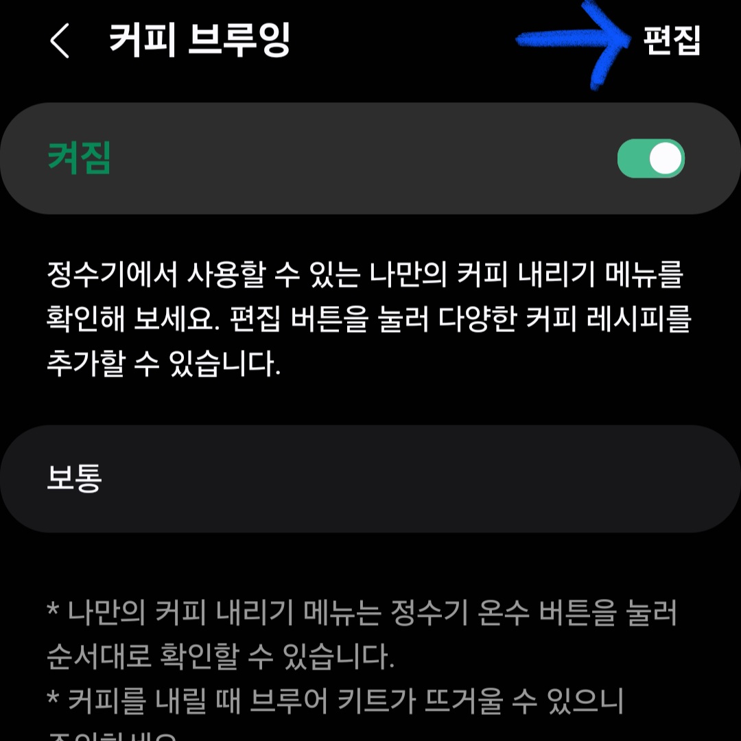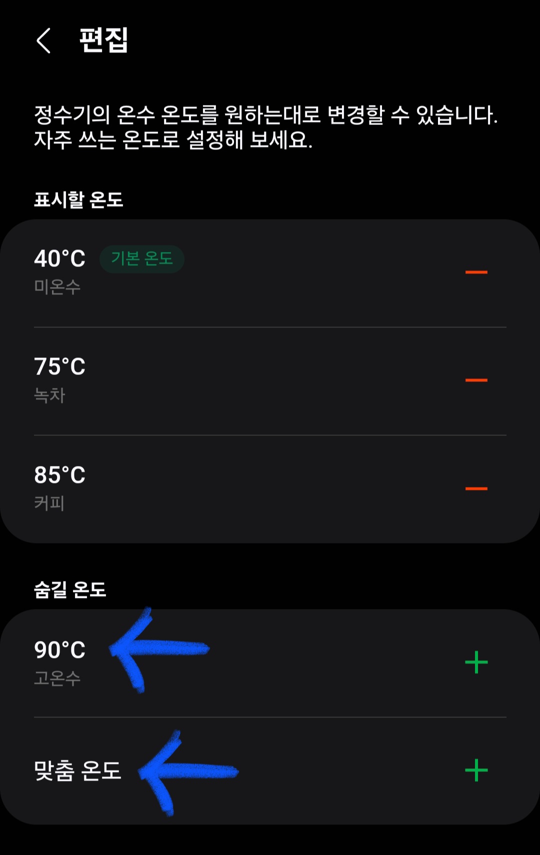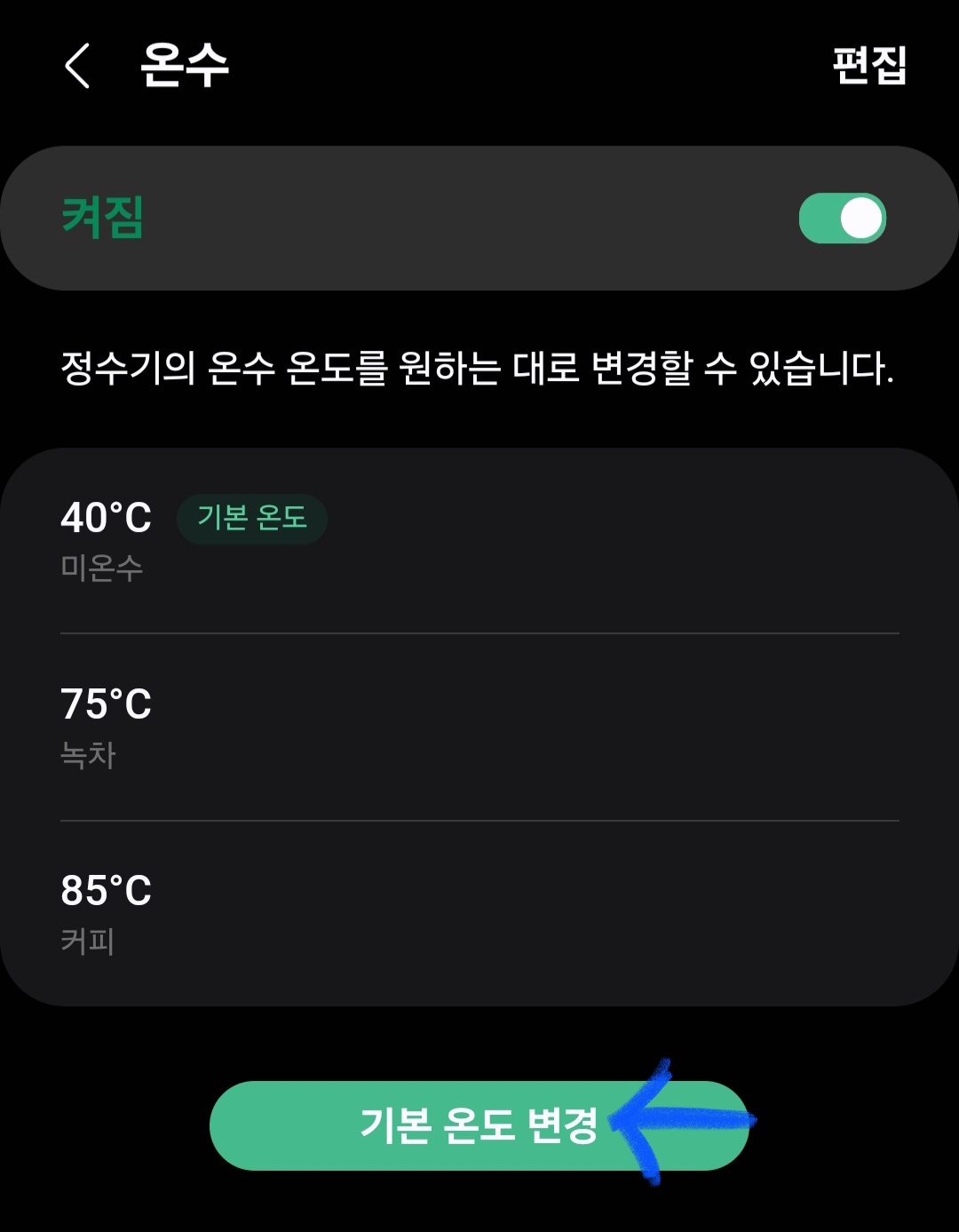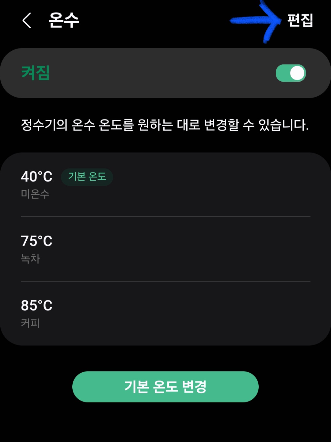▼또한 삼성비스포크정수기는 100도까진 아니어도 최고 온도인 90도까지 설정할 수도 있는데요. 설정 방법은 동일하게 [온수]를 클릭 후 상단에 [편집]을 클릭해 줍니다.